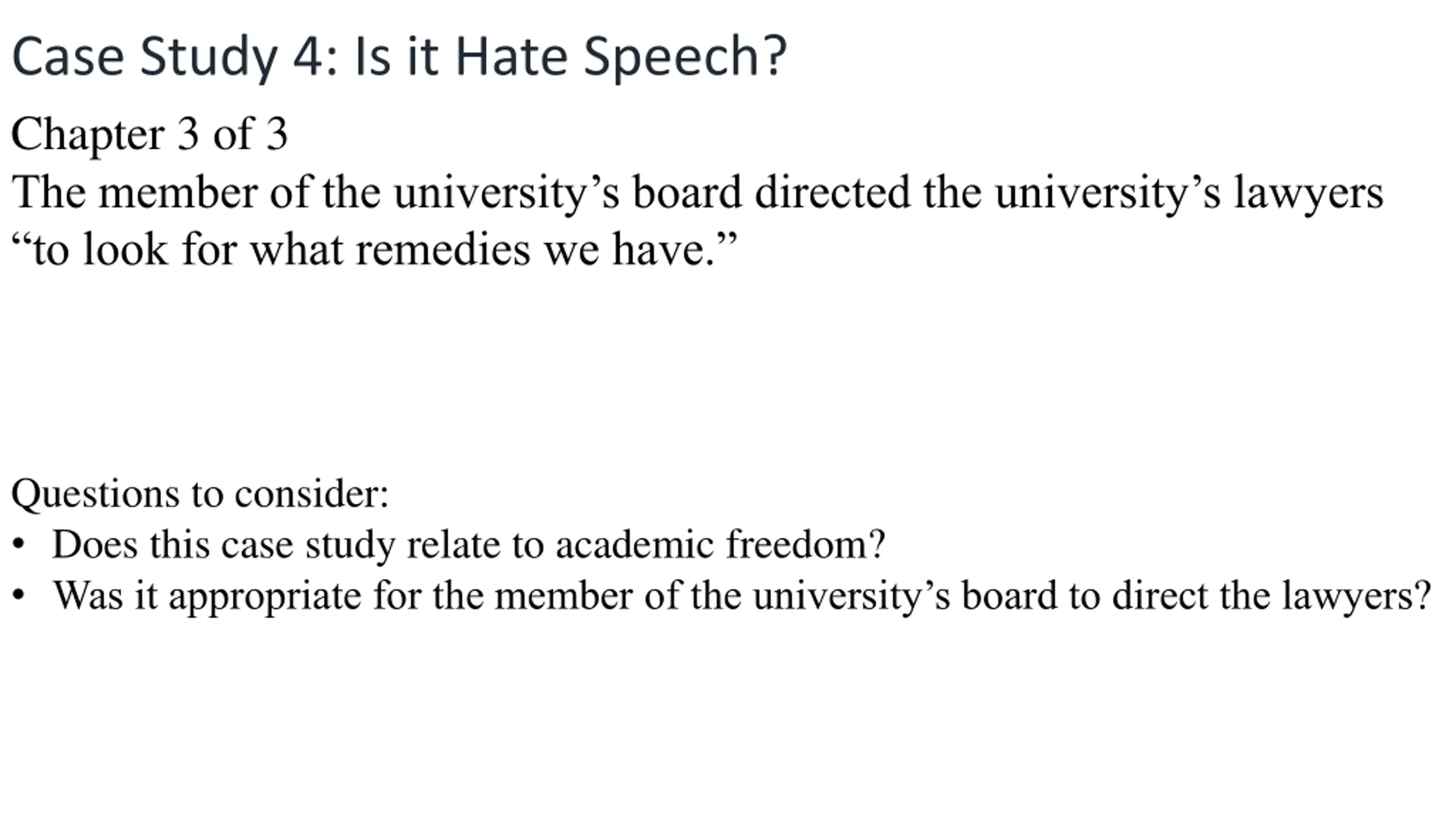 Case Study 4: Is it Hate Speech? Chapter 3 of 3 The member of the university s board directed the university s lawyers to look for what remedies we have. Questions to consider: Does this case study relate to academic freedom? Was it appropriate for the member of the university s board to direct the lawyers?