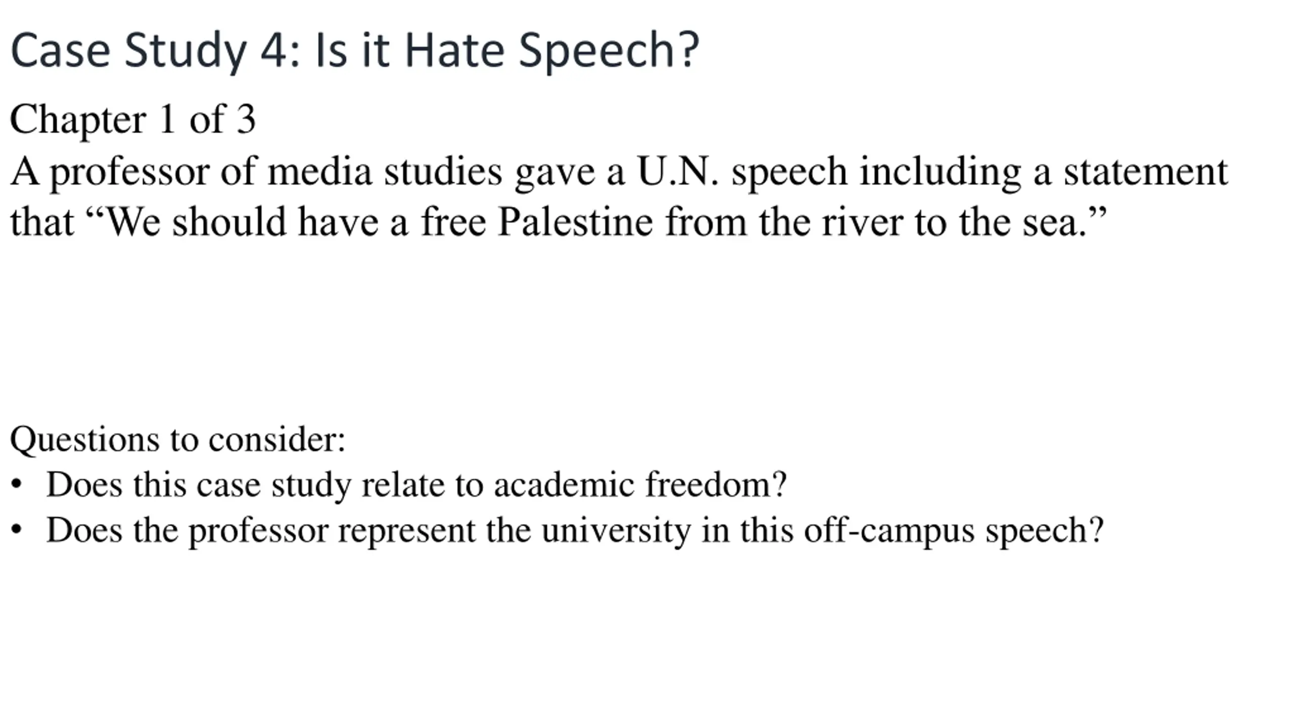 Case Study 4: Is it Hate Speech? Chapter 1 of 3 A professor of media studies gave a U.N. speech including a statement that We should have a free Palestine from the river to the sea. Questions to consider: Does this case study relate to academic freedom? Does the professor represent the university in this off-campus speech?