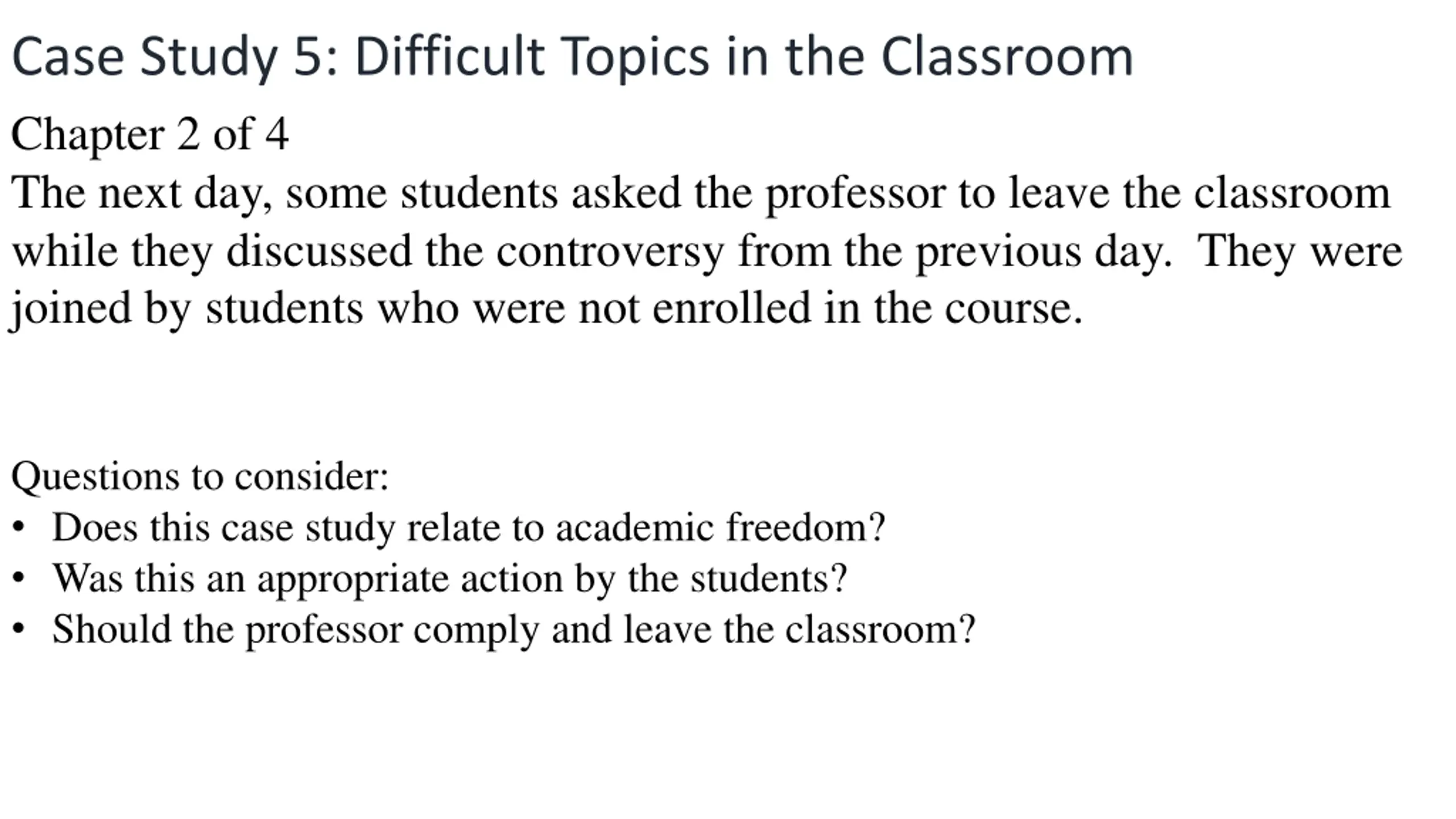Case Study 5: Difficult Topics in the Classroom Chapter 2 of 4 The next day, some students asked the professor to leave the classroom while they discussed the controversy from the previous day. They were joined by students who were not enrolled in the course. Questions to consider: Does this case study relate to academic freedom? Was this an appropriate action by the students? Should the professor comply and leave the classroom?