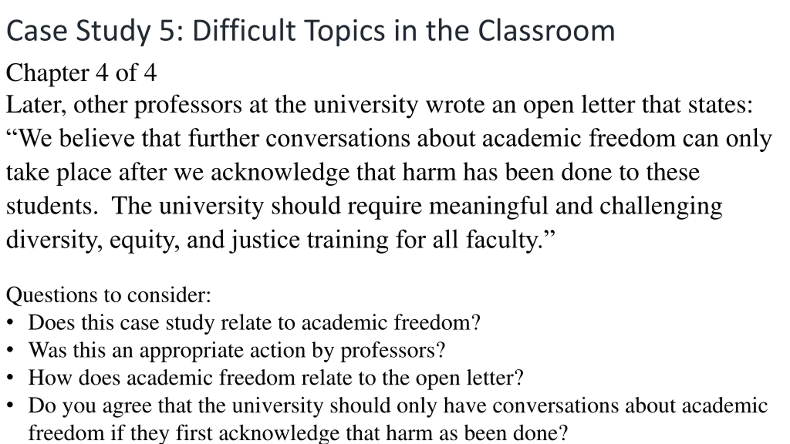 Case Study 5: Difficult Topics in the Classroom Chapter 4 of 4 Later, other professors at the university wrote an open letter that states: We believe that further conversations about academic freedom can only take place after we acknowledge that harm has been done to these students. The university should require meaningful and challenging diversity, equity, and justice training for all faculty. Questions to consider: Does this case study relate to academic freedom? Was this an appropriate action by professors? How does academic freedom relate to the open letter? Do you agree that the university should only have conversations about academic freedom if they first acknowledge that harm as been done?
