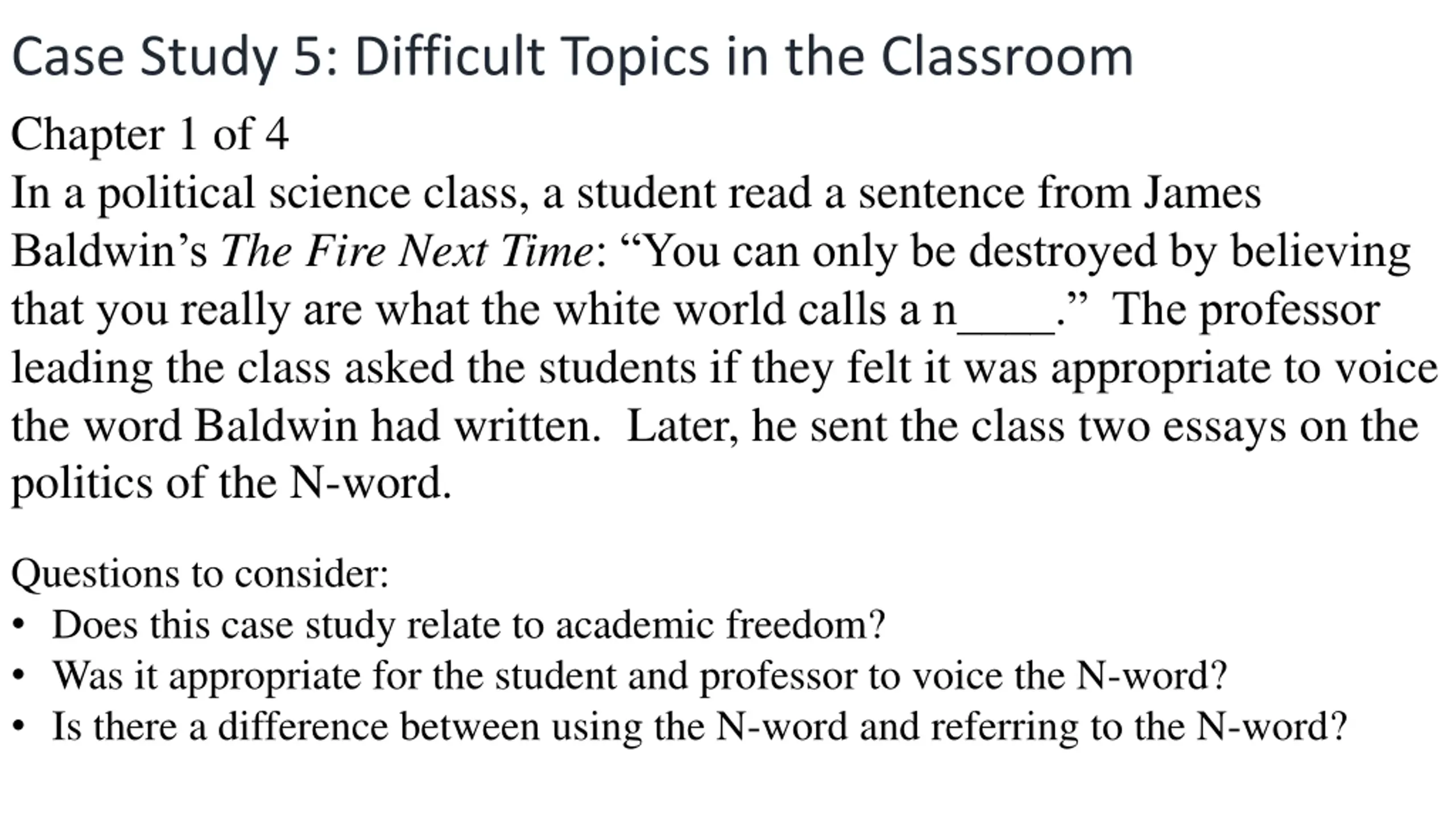 Case Study 5: Difficult Topics in the Classroom Chapter 1 of 4 In a political science class, a student read a sentence from James Baldwin s The Fire Next Time: You can only be destroyed by believing that you really are what the white world calls a n____. The professor leading the class asked the students if they felt it was appropriate to voice the word Baldwin had written. Later, he sent the class two essays on the politics of the N-word. Questions to consider: Does this case study relate to academic freedom? Was it appropriate for the student and professor to voice the N-word? Is there a difference between using the N-word and referring to the N-word?