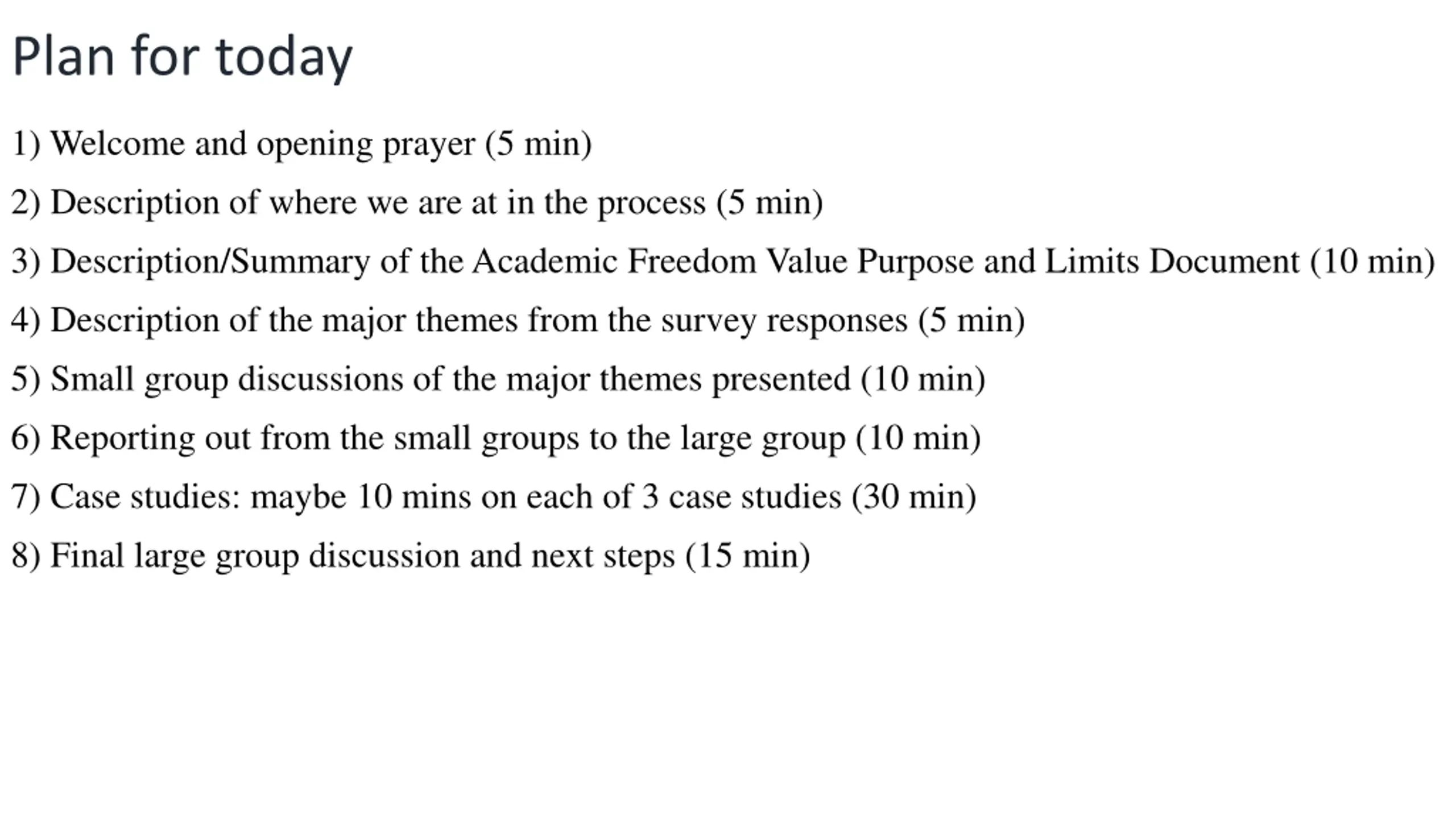 Plan for today 1) Welcome and opening prayer (5 min) 2) Description of where we are at in the process (5 min) 3) Description/Summary of the Academic Freedom Value Purpose and Limits Document (10 min) 4) Description of the major themes from the survey responses (5 min) 5) Small group discussions of the major themes presented (10 min) 6) Reporting out from the small groups to the large group (10 min) 7) Case studies: maybe 10 mins on each of 3 case studies (30 min) 8) Final large group discussion and next steps (15 min)