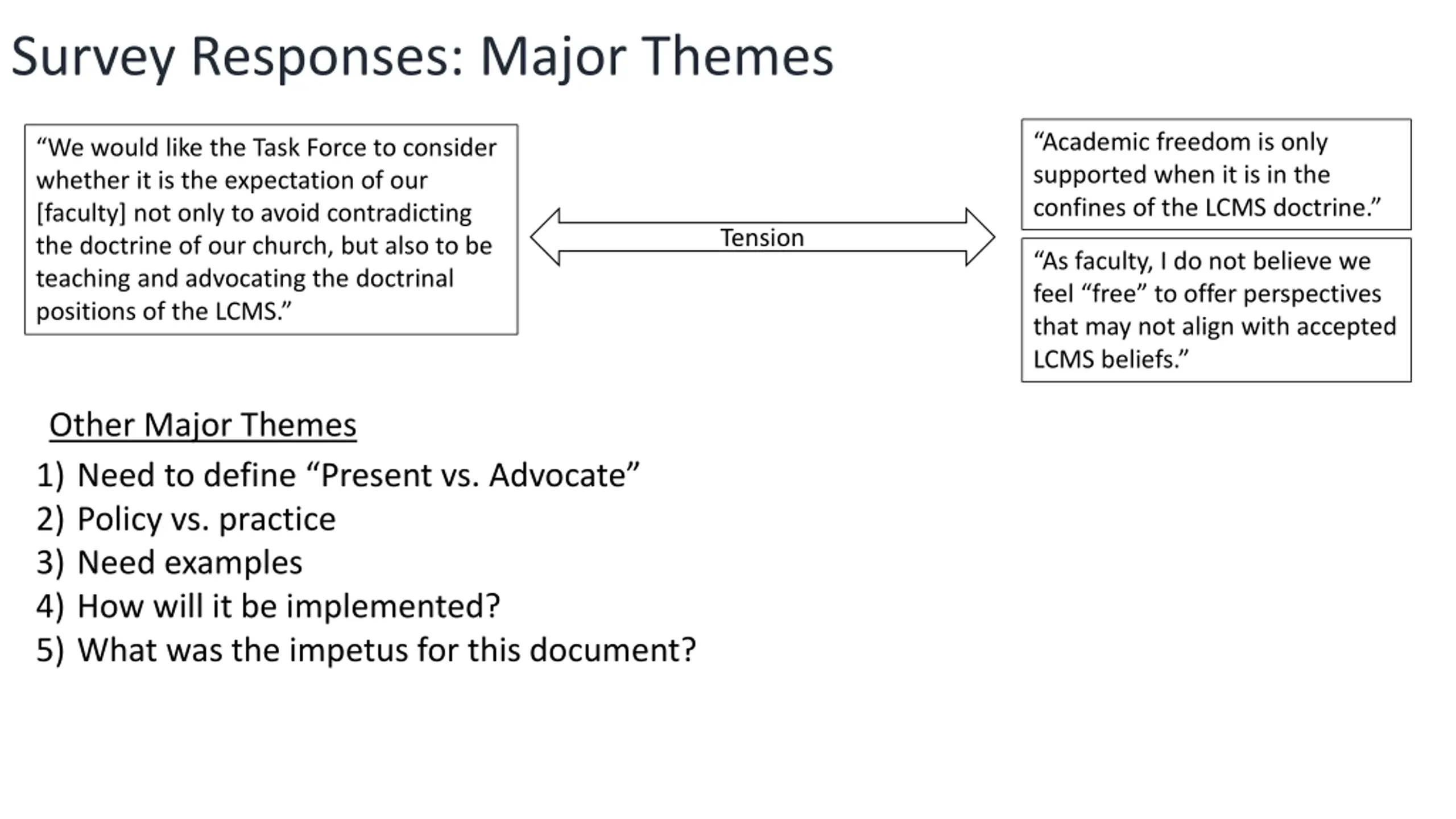 Survey Responses: Major Themes Academic freedom is only supported when it is in the confines of the LCMS doctrine. We would like the Task Force to consider whether it is the expectation of our [faculty] not only to avoid contradicting the doctrine of our church, but also to be teaching and advocating the doctrinal positions of the LCMS. Tension As faculty, I do not believe we feel free to offer perspectives that may not align with accepted LCMS beliefs. Other Major Themes 1) Need to define Present vs. Advocate 2) Policy vs. practice 3) Need examples 4) How will it be implemented? 5) What was the impetus for this document?