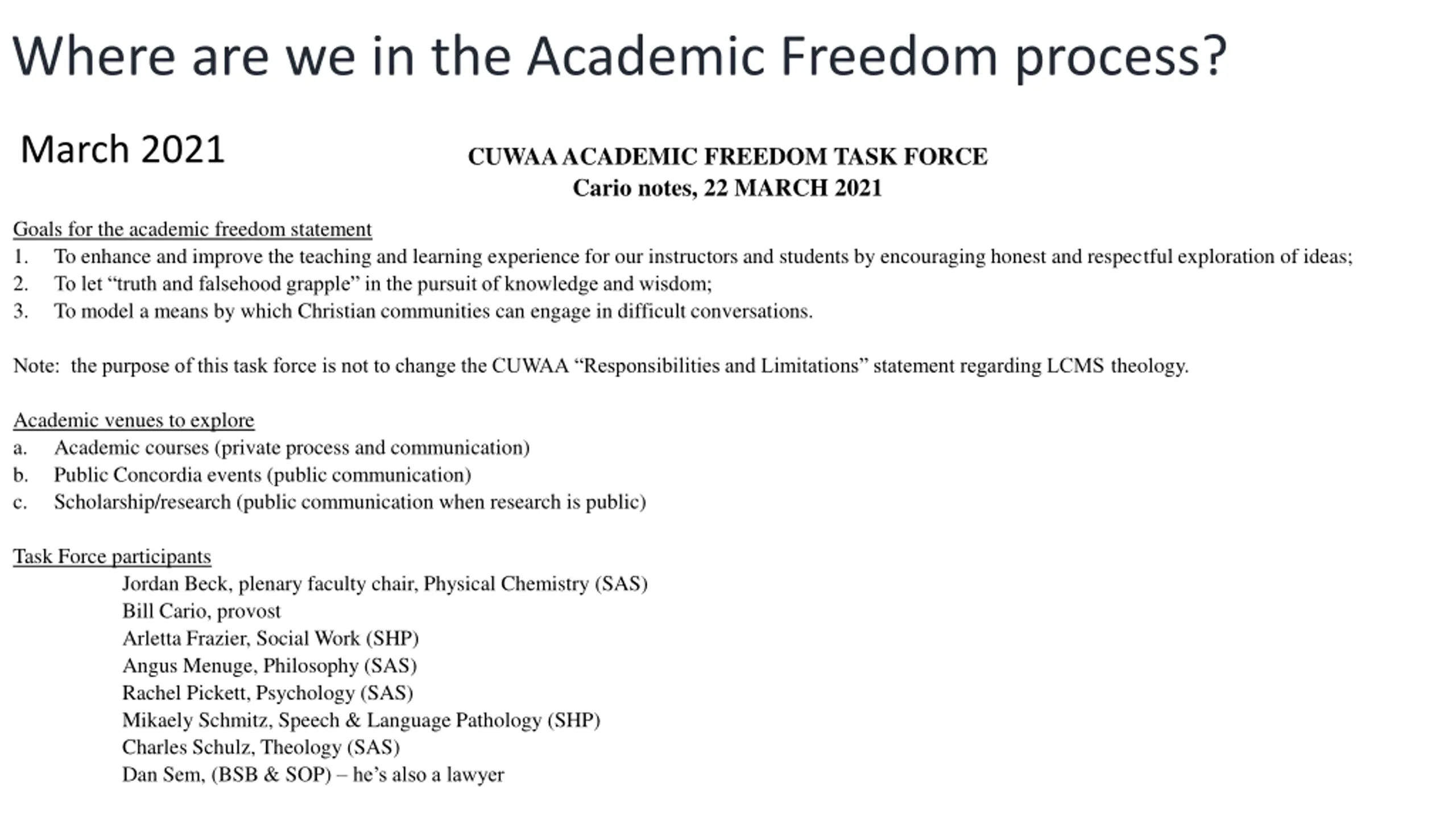 Where are we in the Academic Freedom process? March 2021 CUWAA ACADEMIC FREEDOM TASK FORCE Cario notes, 22 MARCH 2021 Goals for the academic freedom statement 1. To enhance and improve the teaching and learning experience for our instructors and students by encouraging honest and respectful exploration of ideas; 2. To let truth and falsehood grapple in the pursuit of knowledge and wisdom; 3. To model a means by which Christian communities can engage in difficult conversations. Note: the purpose of this task force is not to change the CUWAA Responsibilities and Limitations statement regarding LCMS theology. Academic venues to explore a. Academic courses (private process and communication) b. Public Concordia events (public communication) c. Scholarship/research (public communication when research is public) Task Force participants Jordan Beck, plenary faculty chair, Physical Chemistry (SAS) Bill Cario, provost Arletta Frazier, Social Work (SHP) Angus Menuge, Philosophy (SAS) Rachel Pickett, Psychology (SAS) Mikaely Schmitz, Speech & Language Pathology (SHP) Charles Schulz, Theology (SAS) Dan Sem, (BSB & SOP) he s also a lawyer