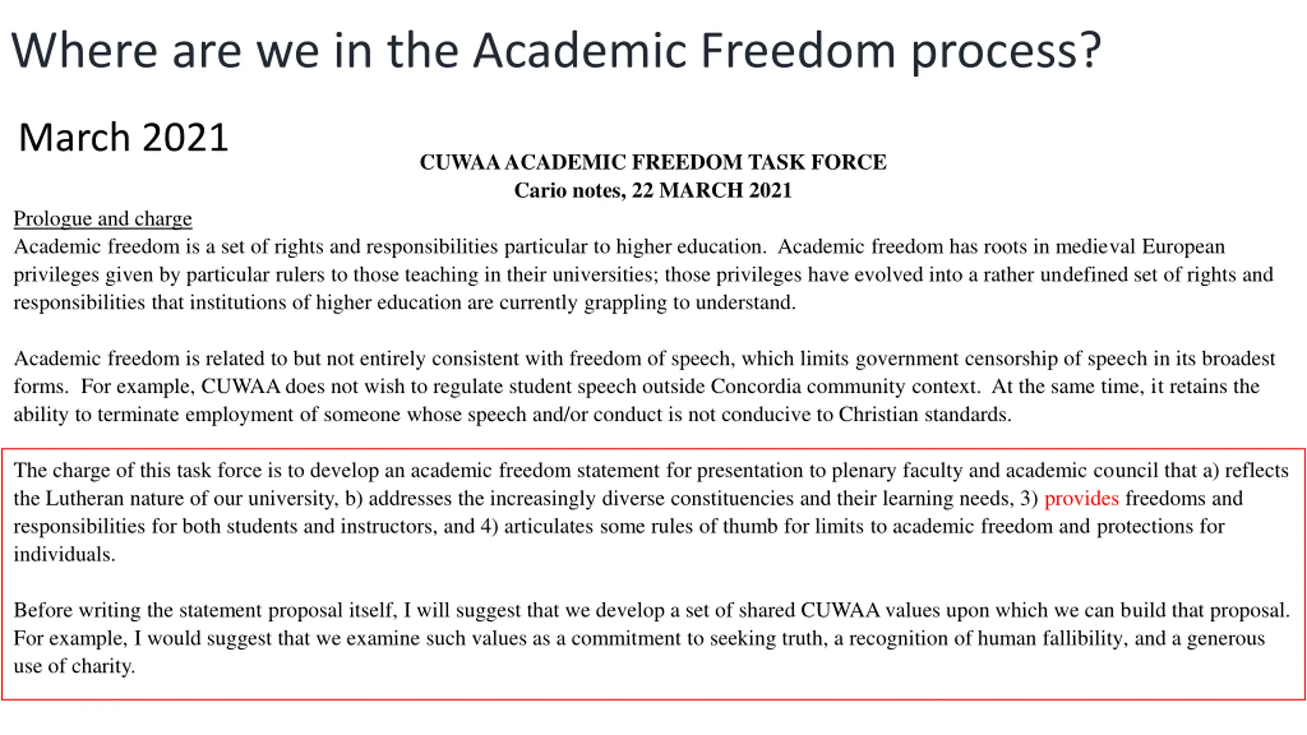 Where are we in the Academic Freedom process? March 2021 CUWAA ACADEMIC FREEDOM TASK FORCE Cario notes, 22 MARCH 2021 Prologue and charge Academic freedom is a set of rights and responsibilities particular to higher education. Academic freedom has roots in medieval European privileges given by particular rulers to those teaching in their universities; those privileges have evolved into a rather undefined set of rights and responsibilities that institutions of higher education are currently grappling to understand. Academic freedom is related to but not entirely consistent with freedom of speech, which limits government censorship of speech in its broadest forms. For example, CUWAA does not wish to regulate student speech outside Concordia community context. At the same time, it retains the ability to terminate employment of someone whose speech and/or conduct is not conducive to Christian standards. The charge of this task force is to develop an academic freedom statement for presentation to plenary faculty and academic council that a) reflects the Lutheran nature of our university, b) addresses the increasingly diverse constituencies and their learning needs, 3) provides freedoms and responsibilities for both students and instructors, and 4) articulates some rules of thumb for limits to academic freedom and protections for individuals. Before writing the statement proposal itself, I will suggest that we develop a set of shared CUWAA values upon which we can build that proposal. For example, I would suggest that we examine such values as a commitment to seeking truth, a recognition of human fallibility, and a generous use of charity.