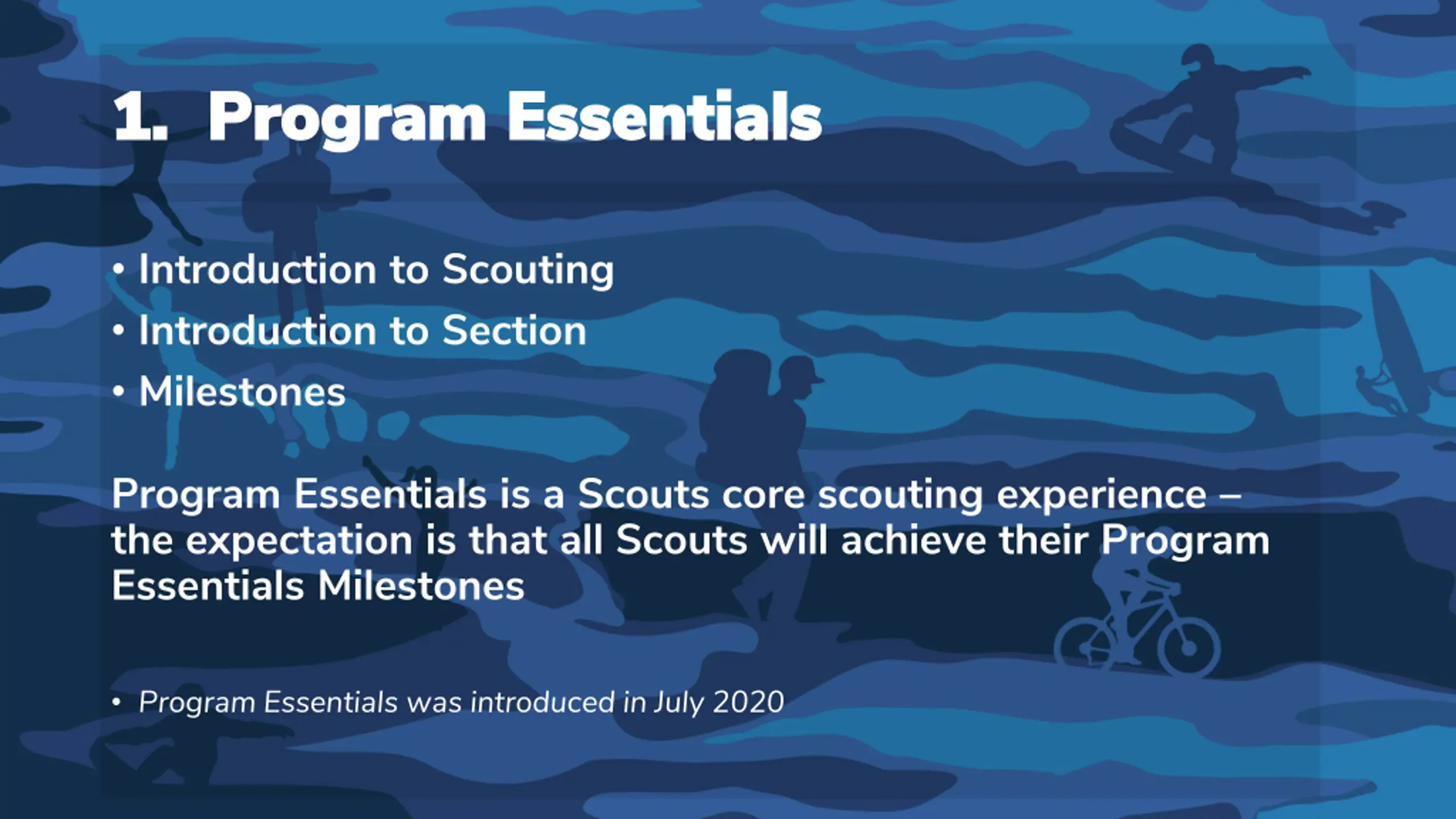 1. Program Essentials 1. Program Essentials Introduction to Scouting Introduction to Section Milestones Program Essentials is a Scouts core scouting experience the expectation is that all Scouts will achieve their Program Essentials Milestones Program Essentials was introduced in July 2020