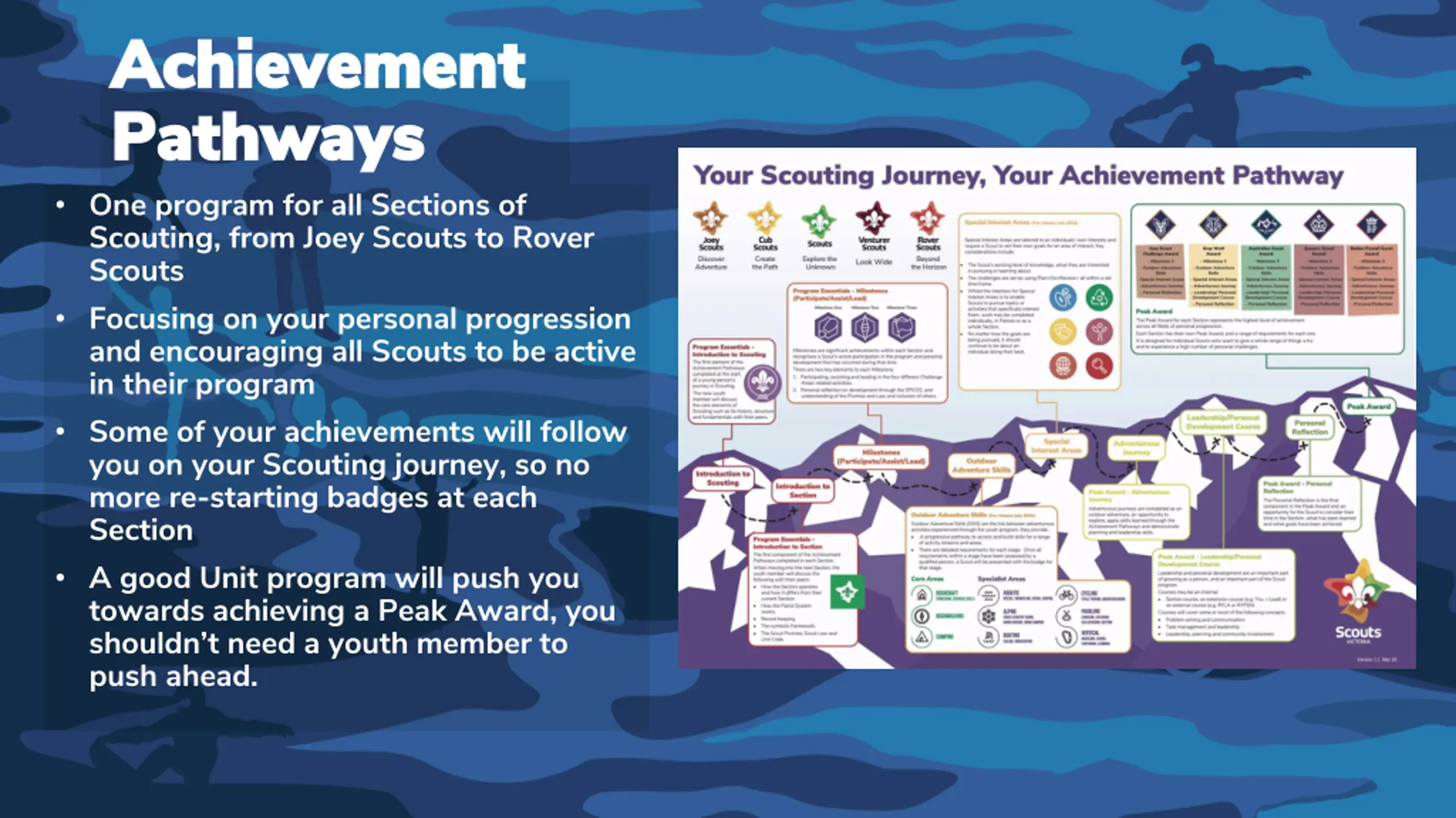 Achievement Achievement Pathways Pathways One program for all Sections of Scouting, from Joey Scouts to Rover Scouts Focusing on your personal progression and encouraging all Scouts to be active in their program Some of your achievements will follow you on your Scouting journey, so no more re-starting badges at each Section A good Unit program will push you towards achieving a Peak Award, you shouldn t need a youth member to push ahead.