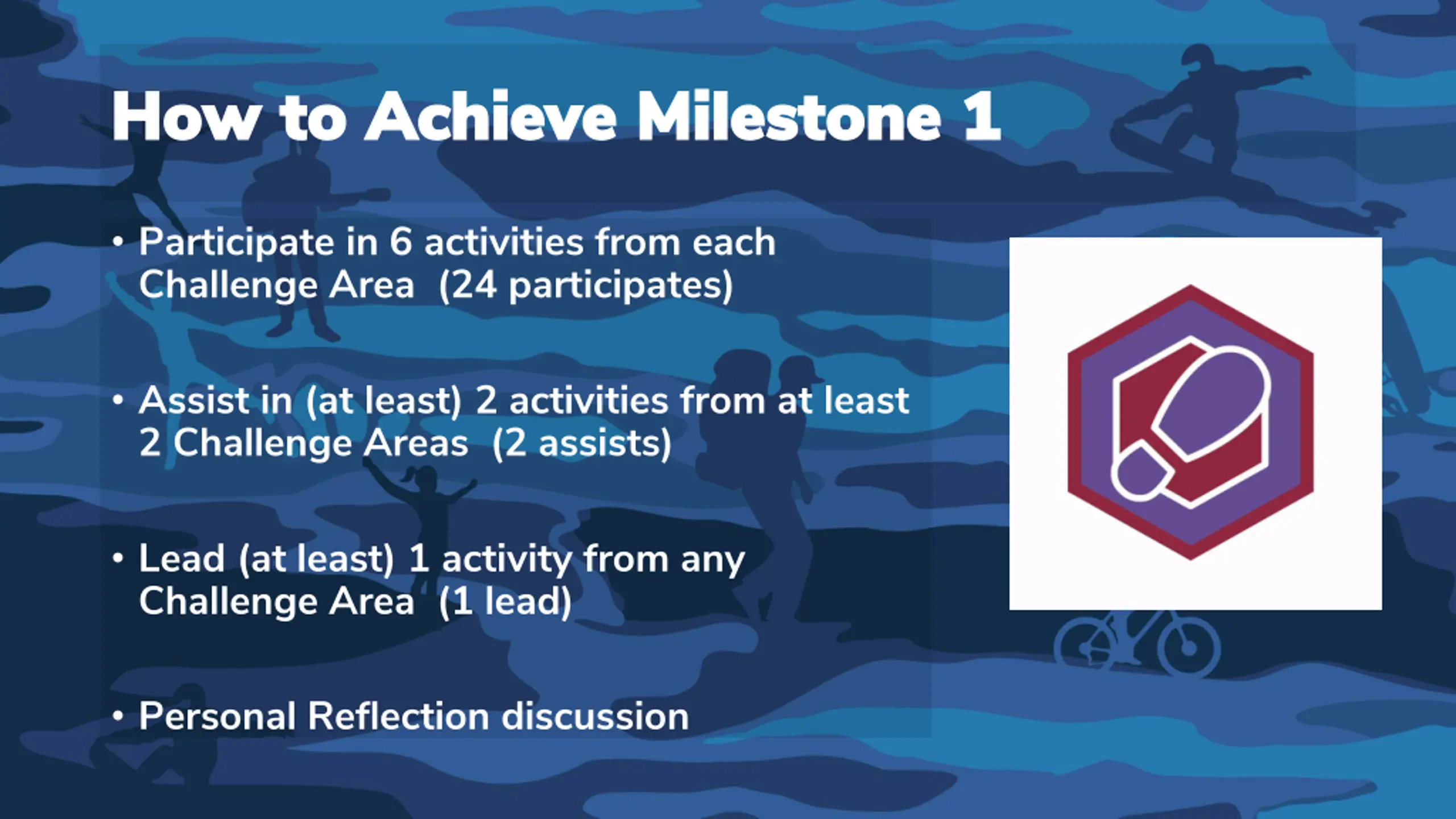 How to Achieve Milestone 1 How to Achieve Milestone 1 Participate in 6 activities from each Challenge Area (24 participates) Assist in (at least) 2 activities from at least 2 Challenge Areas (2 assists) Lead (at least) 1 activity from any Challenge Area (1 lead) Personal Reflection discussion