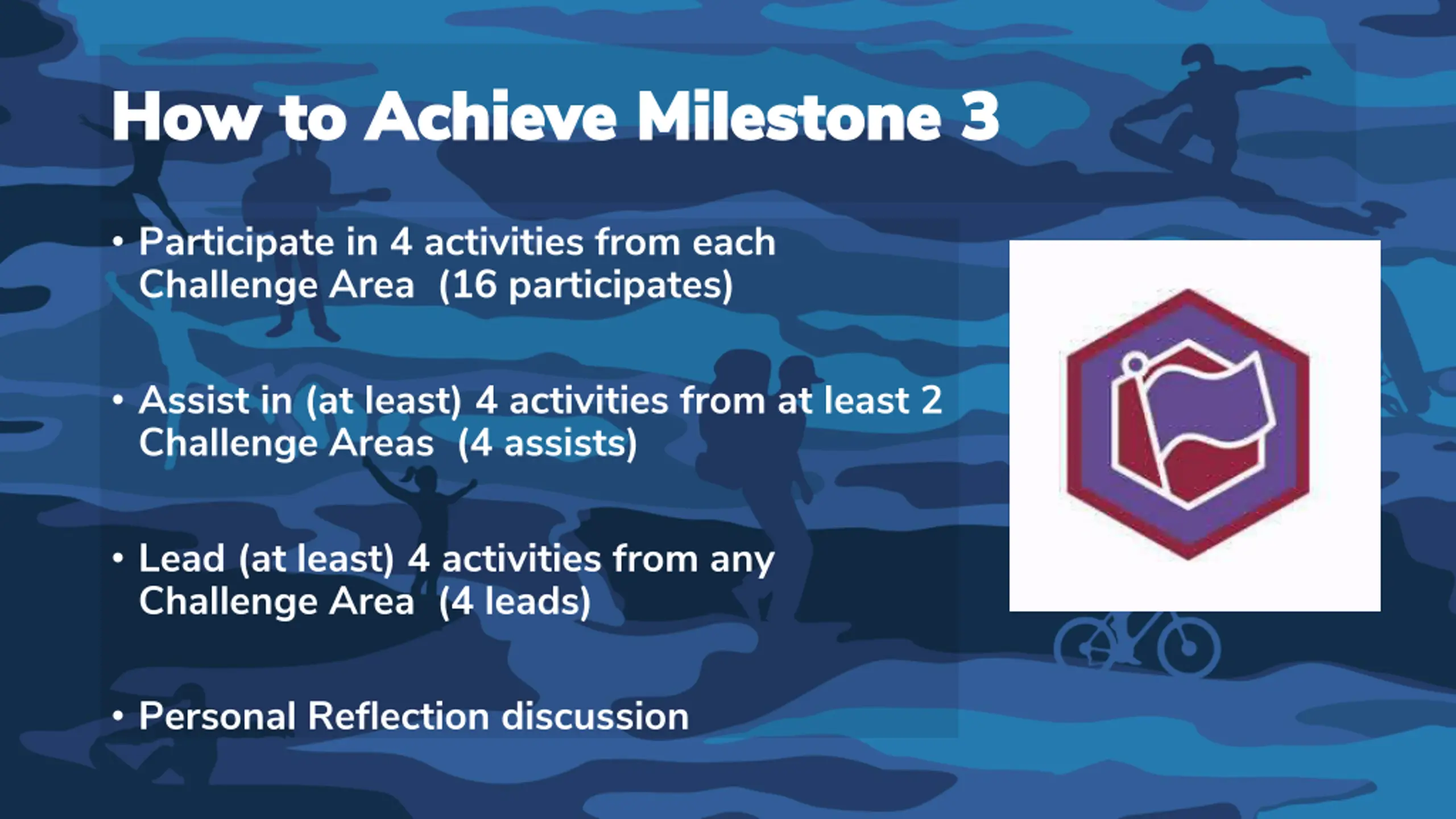 How to Achieve Milestone 3 How to Achieve Milestone 3 Participate in 4 activities from each Challenge Area (16 participates) Assist in (at least) 4 activities from at least 2 Challenge Areas (4 assists) Lead (at least) 4 activities from any Challenge Area (4 leads) Personal Reflection discussion