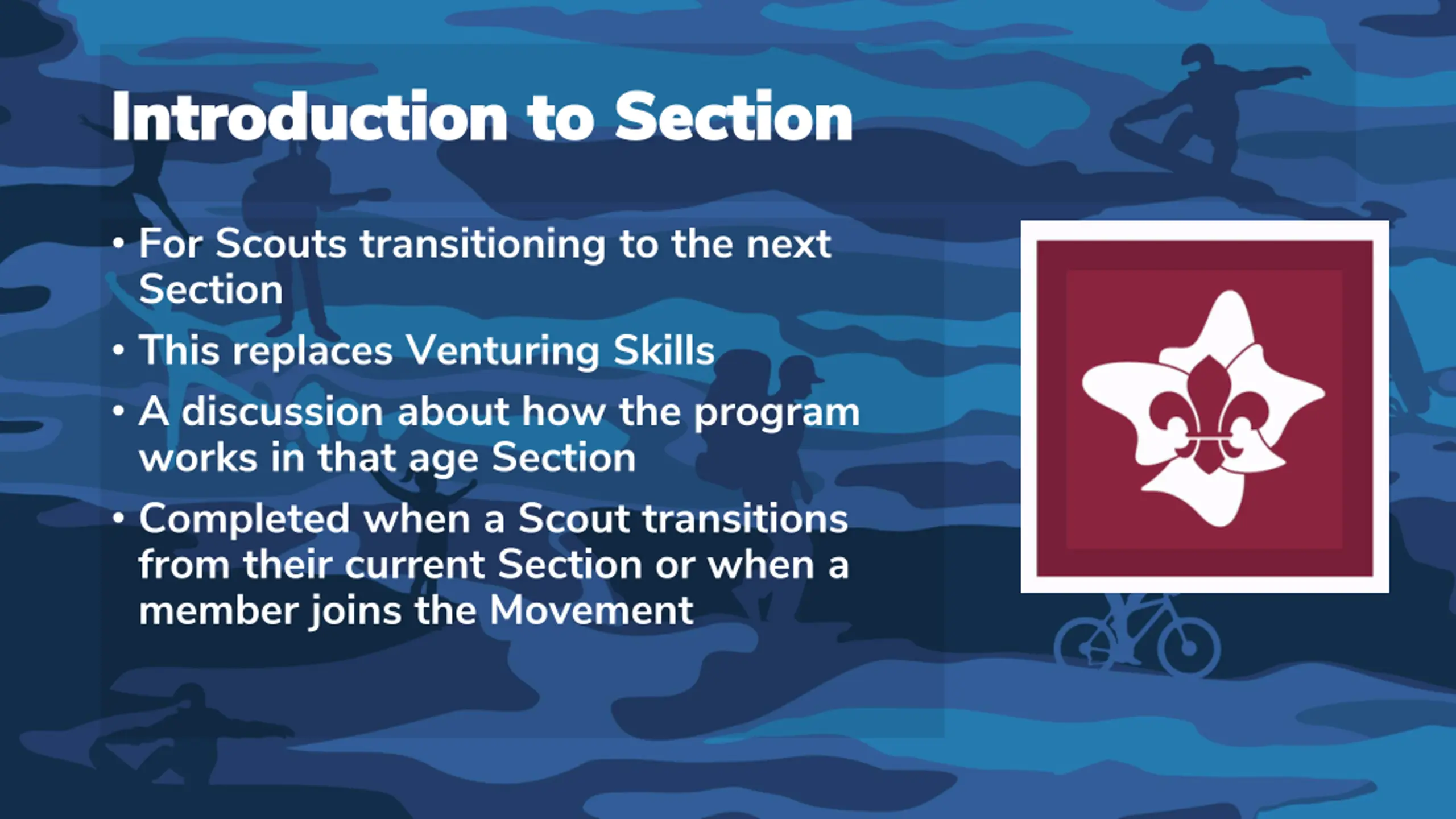 Introduction to Section Introduction to Section For Scouts transitioning to the next Section This replaces Venturing Skills A discussion about how the program works in that age Section Completed when a Scout transitions from their current Section or when a member joins the Movement