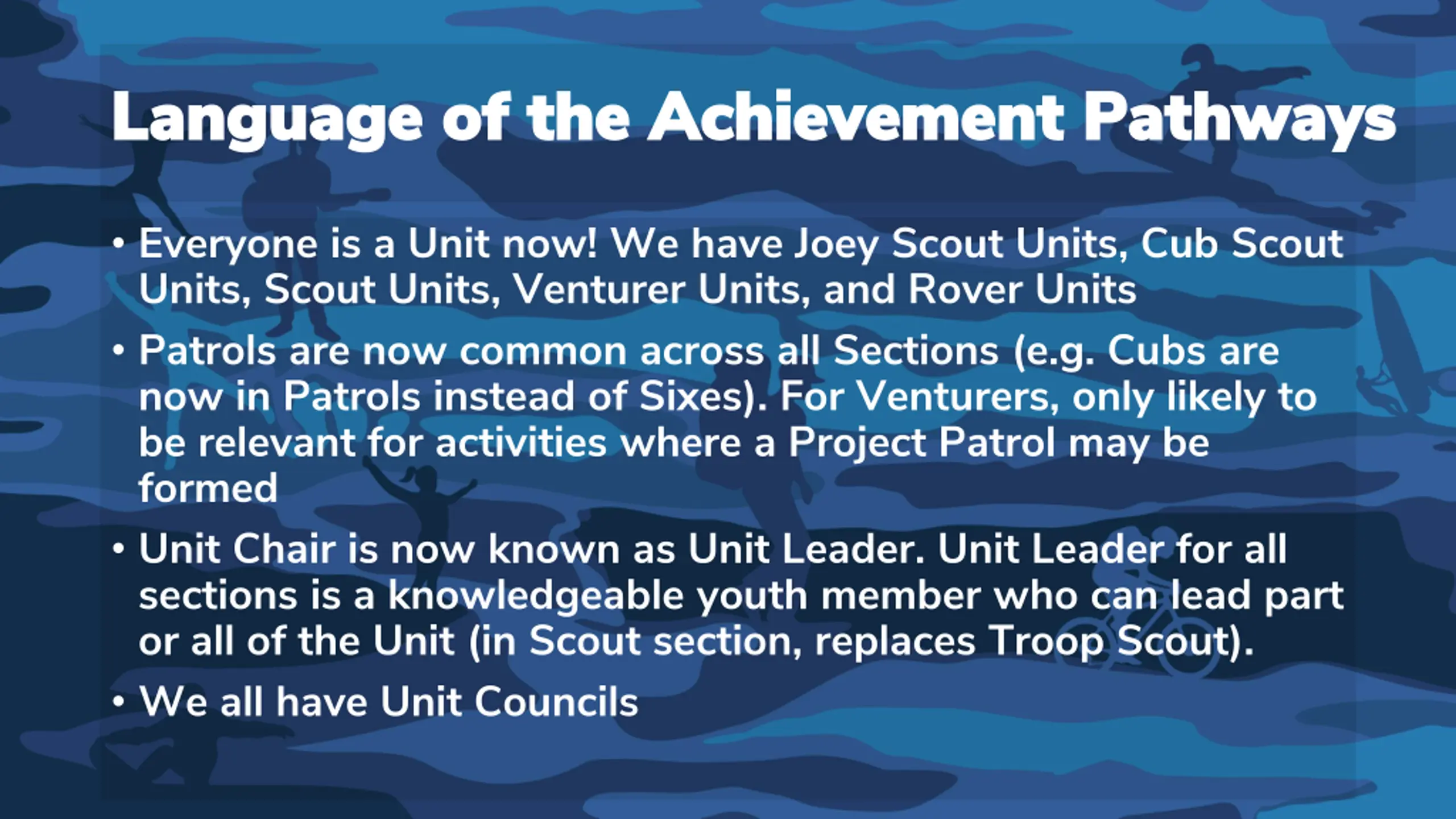 Language of the Achievement Pathways Language of the Achievement Pathways Everyone is a Unit now! We have Joey Scout Units, Cub Scout Units, Scout Units, Venturer Units, and Rover Units Patrols are now common across all Sections (e.g. Cubs are now in Patrols instead of Sixes). For Venturers, only likely to be relevant for activities where a Project Patrol may be formed Unit Chair is now known as Unit Leader. Unit Leader for all sections is a knowledgeable youth member who can lead part or all of the Unit (in Scout section, replaces Troop Scout). We all have Unit Councils