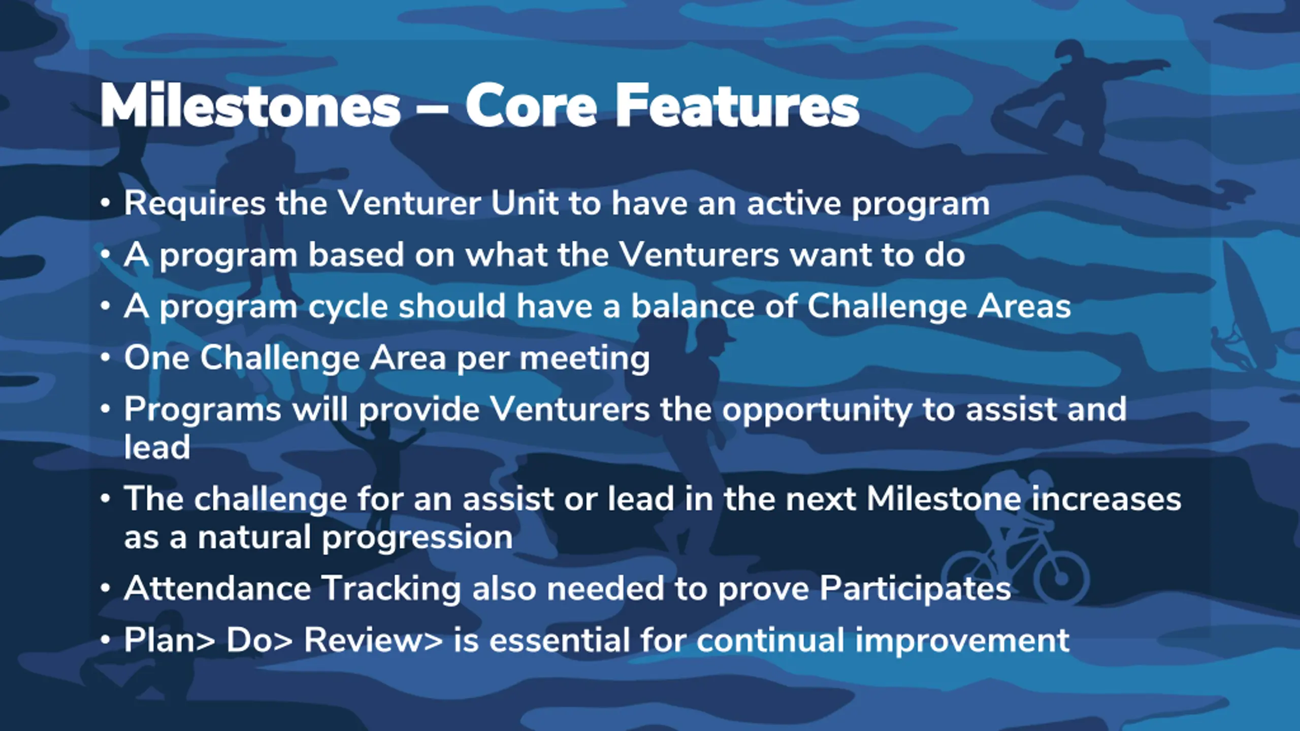 Milestones Milestones Core Features Core Features Requires the Venturer Unit to have an active program A program based on what the Venturers want to do A program cycle should have a balance of Challenge Areas One Challenge Area per meeting Programs will provide Venturers the opportunity to assist and lead The challenge for an assist or lead in the next Milestone increases as a natural progression Attendance Tracking also needed to prove Participates Plan> Do> Review> is essential for continual improvement