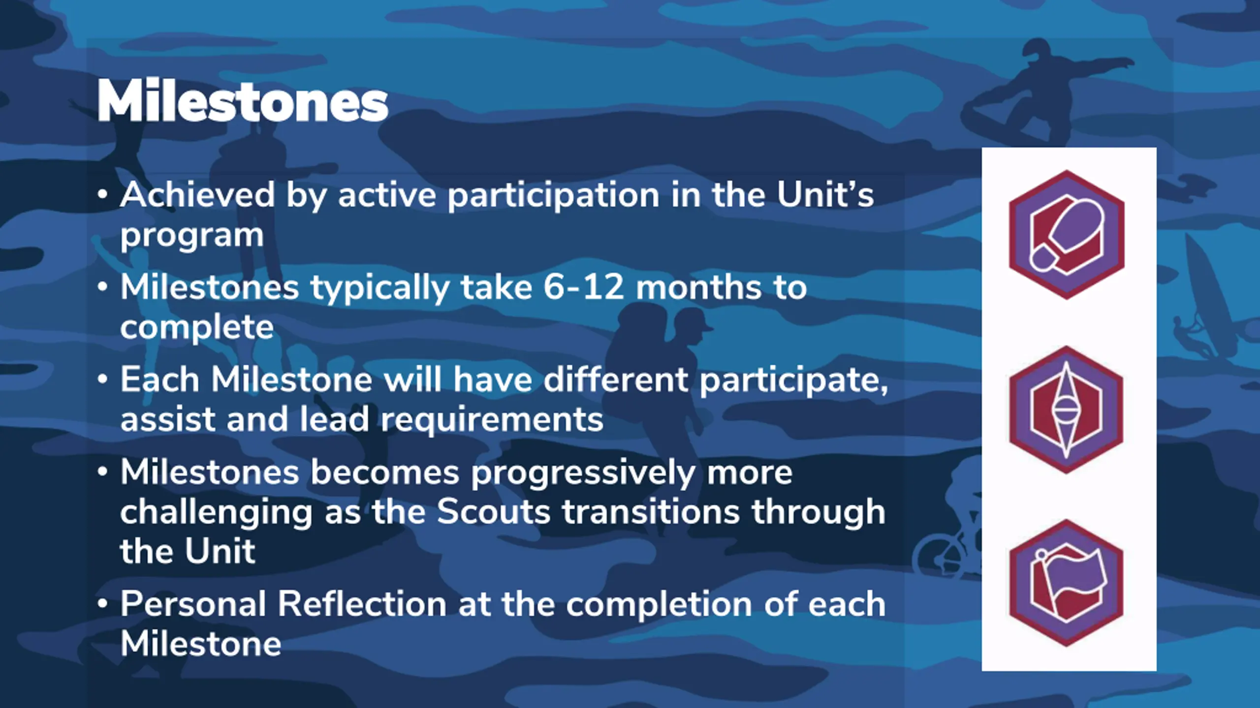 Milestones Milestones Achieved by active participation in the Unit s program Milestones typically take 6-12 months to complete Each Milestone will have different participate, assist and lead requirements Milestones becomes progressively more challenging as the Scouts transitions through the Unit Personal Reflection at the completion of each Milestone