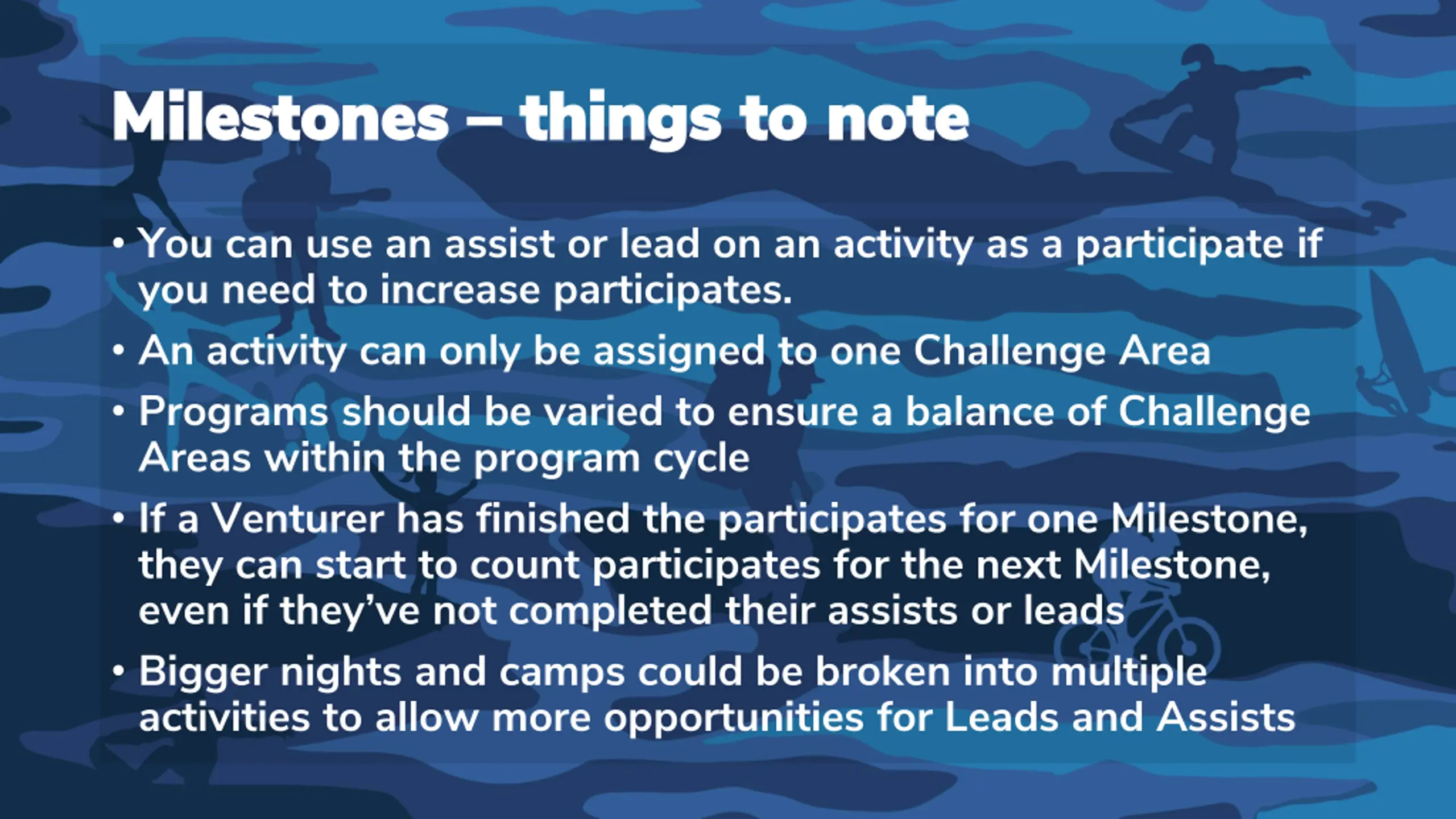 Milestones Milestones things to note things to note You can use an assist or lead on an activity as a participate if you need to increase participates. An activity can only be assigned to one Challenge Area Programs should be varied to ensure a balance of Challenge Areas within the program cycle If a Venturer has finished the participates for one Milestone, they can start to count participates for the next Milestone, even if they ve not completed their assists or leads Bigger nights and camps could be broken into multiple activities to allow more opportunities for Leads and Assists