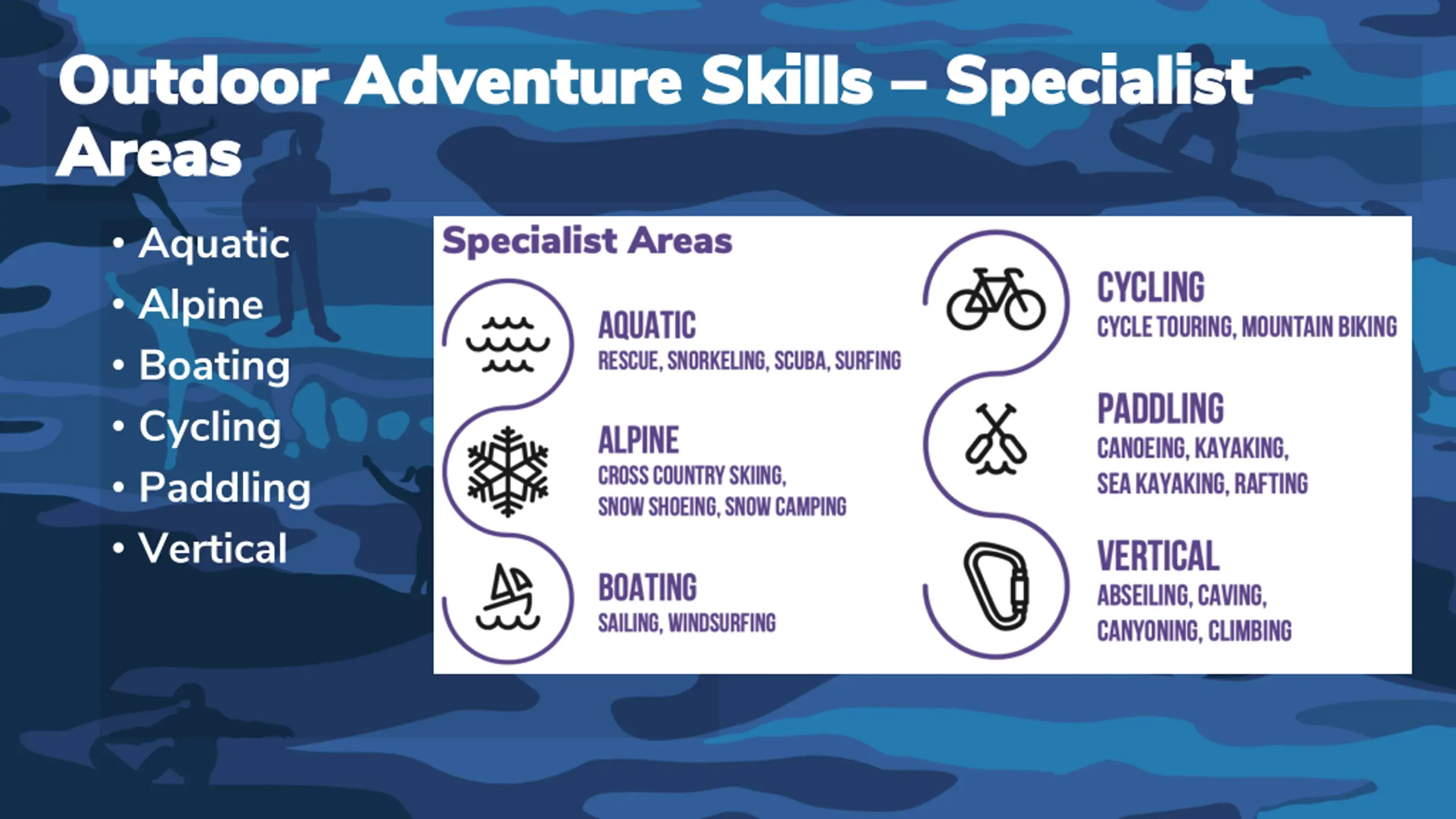 Outdoor Adventure Skills Outdoor Adventure Skills Specialist Areas Areas Aquatic Alpine Boating Cycling Paddling Vertical Specialist