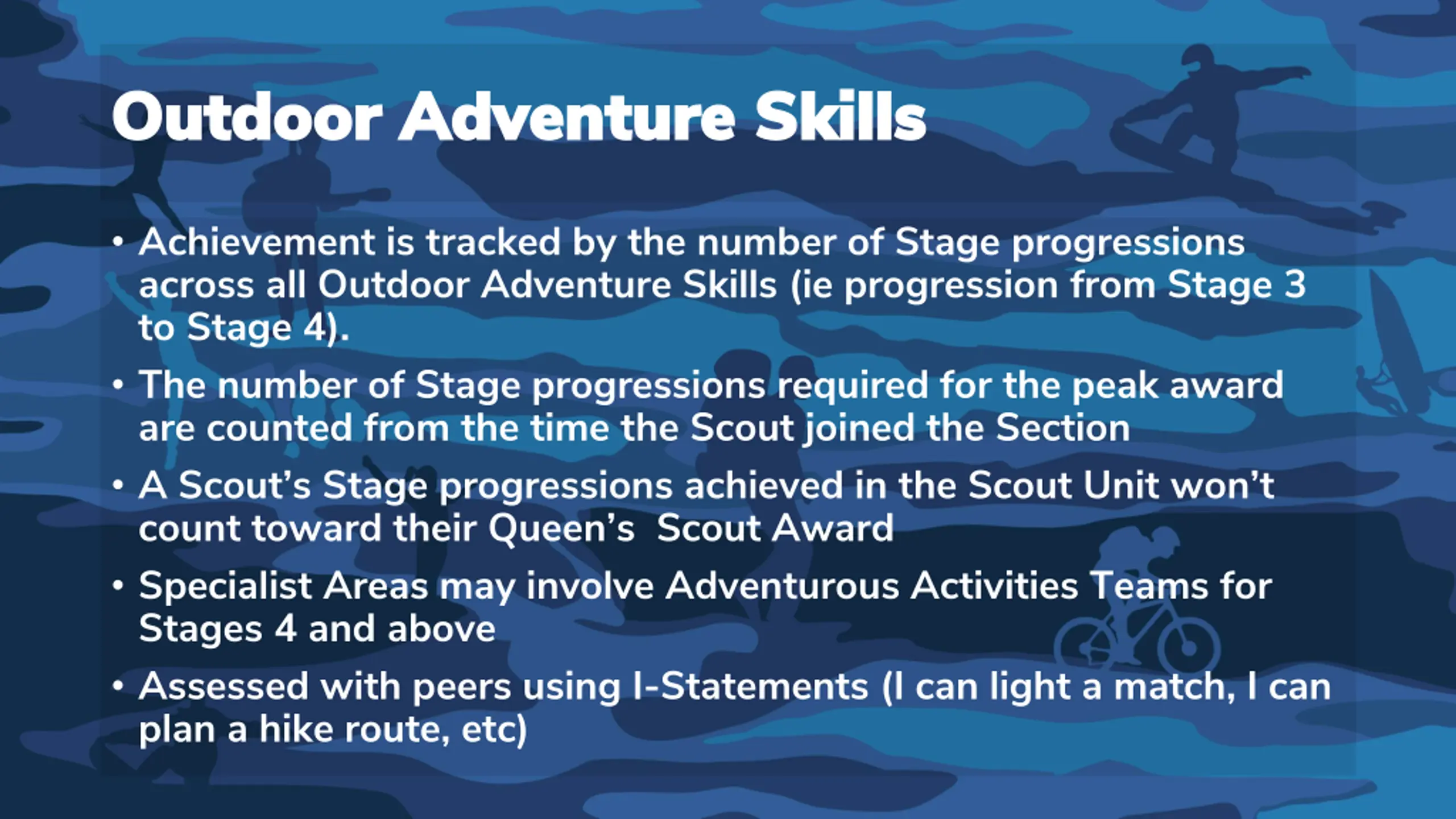 Outdoor Adventure Skills Outdoor Adventure Skills Achievement is tracked by the number of Stage progressions across all Outdoor Adventure Skills (ie progression from Stage 3 to Stage 4). The number of Stage progressions required for the peak award are counted from the time the Scout joined the Section A Scout s Stage progressions achieved in the Scout Unit won t count toward their Queen s Scout Award Specialist Areas may involve Adventurous Activities Teams for Stages 4 and above Assessed with peers using I-Statements (I can light a match, I can plan a hike route, etc)
