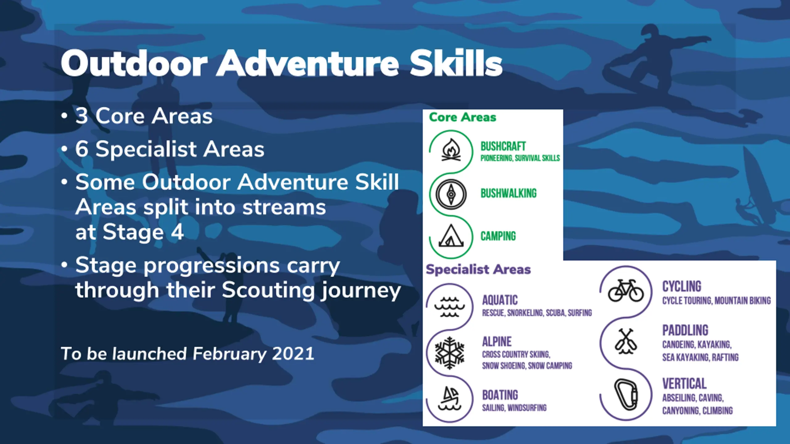 Outdoor Adventure Skills Outdoor Adventure Skills 3 Core Areas 6 Specialist Areas Some Outdoor Adventure Skill Areas split into streams at Stage 4 Stage progressions carry through their Scouting journey To be launched February 2021