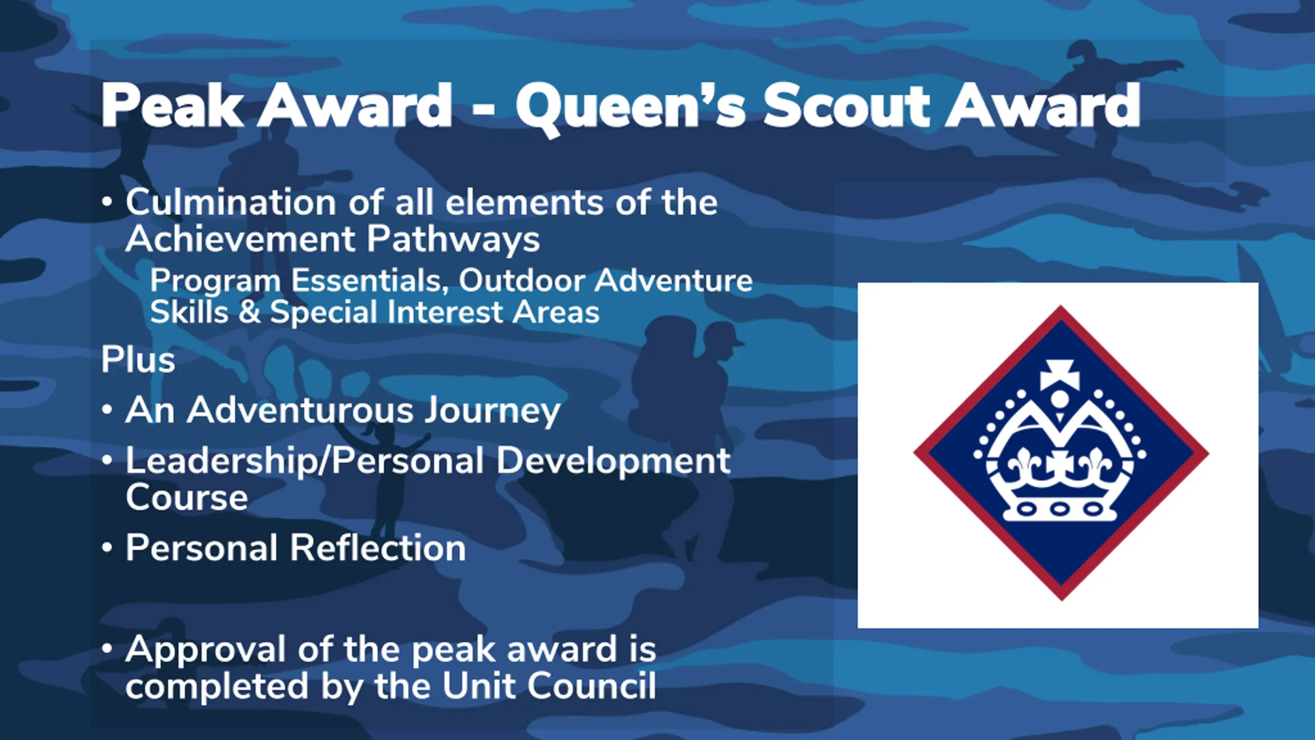 Peak Award Peak Award - - Queen s Scout Award Queen s Scout Award Culmination of all elements of the Achievement Pathways Program Essentials, Outdoor Adventure Skills & Special Interest Areas Plus An Adventurous Journey Leadership/Personal Development Course Personal Reflection Approval of the peak award is completed by the Unit Council