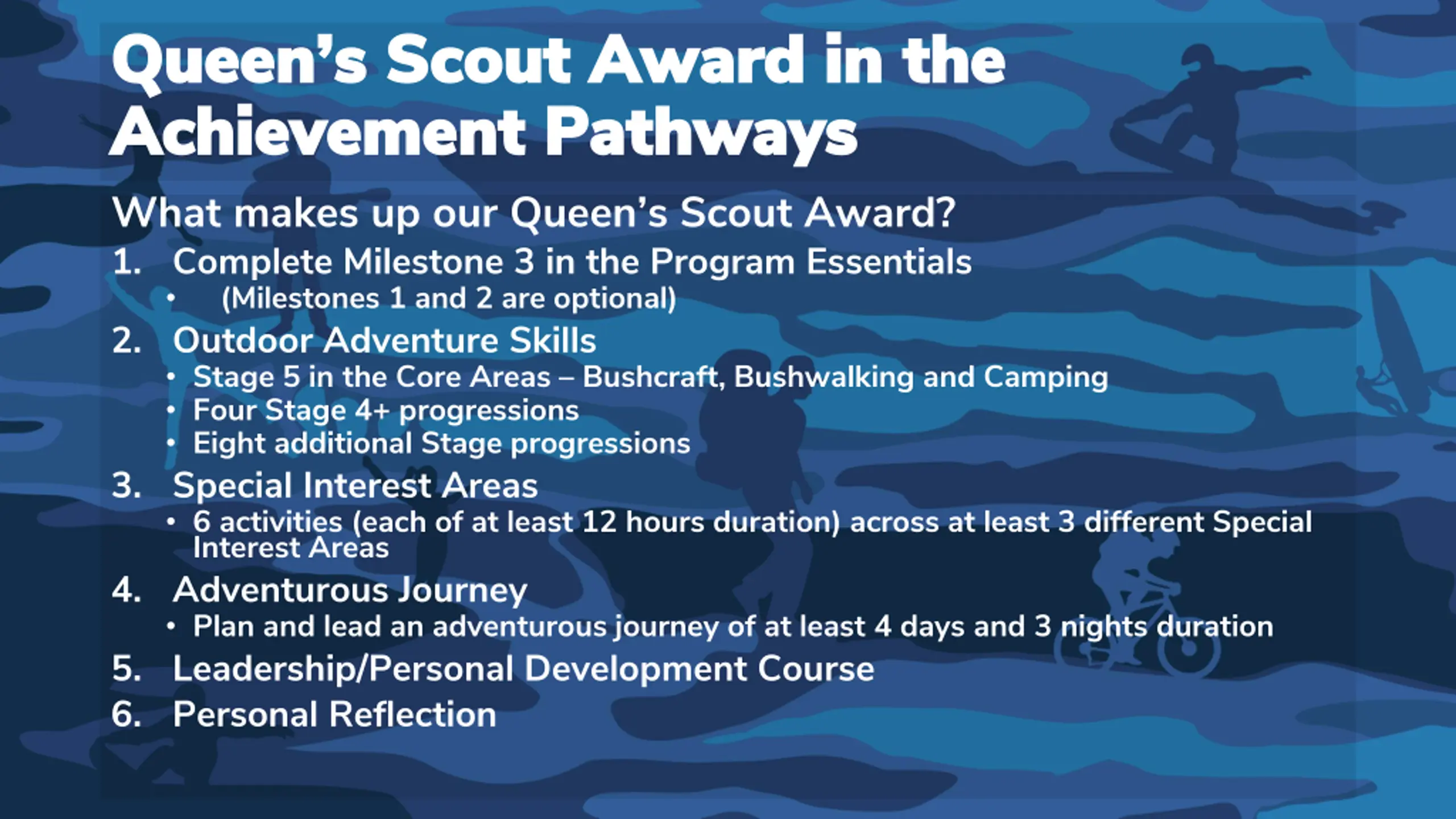 Queens Scout Award in the Queen s Scout Award in the Achievement Pathways Achievement Pathways What makes up our Queen s Scout Award? 1. Complete Milestone 3 in the Program Essentials (Milestones 1 and 2 are optional) 2. Outdoor Adventure Skills Stage 5 in the Core Areas Bushcraft, Bushwalking and Camping Four Stage 4+ progressions Eight additional Stage progressions 3. Special Interest Areas 6 activities (each of at least 12 hours duration) across at least 3 different Special Interest Areas 4. Adventurous Journey Plan and lead an adventurous journey of at least 4 days and 3 nights duration 5. Leadership/Personal Development Course 6. Personal Reflection