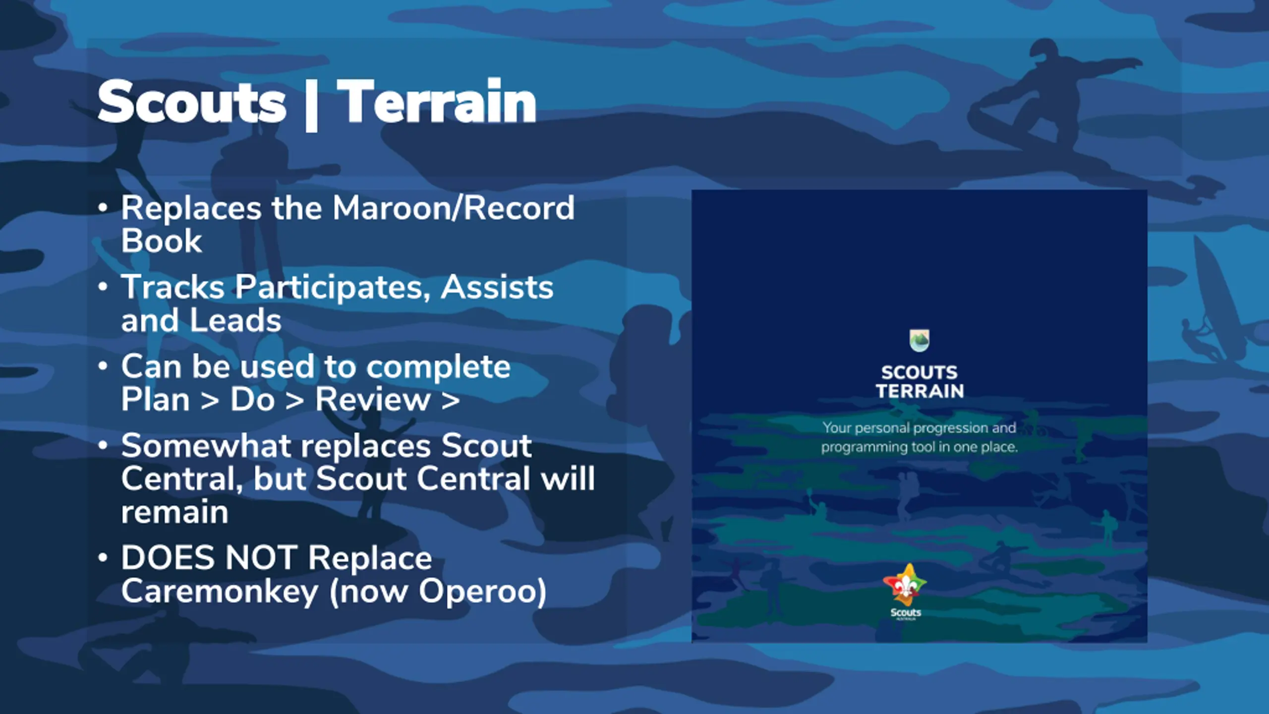 Scouts | Terrain Scouts | Terrain Replaces the Maroon/Record Book Tracks Participates, Assists and Leads Can be used to complete Plan > Do > Review > Somewhat replaces Scout Central, but Scout Central will remain DOES NOT Replace Caremonkey (now Operoo)