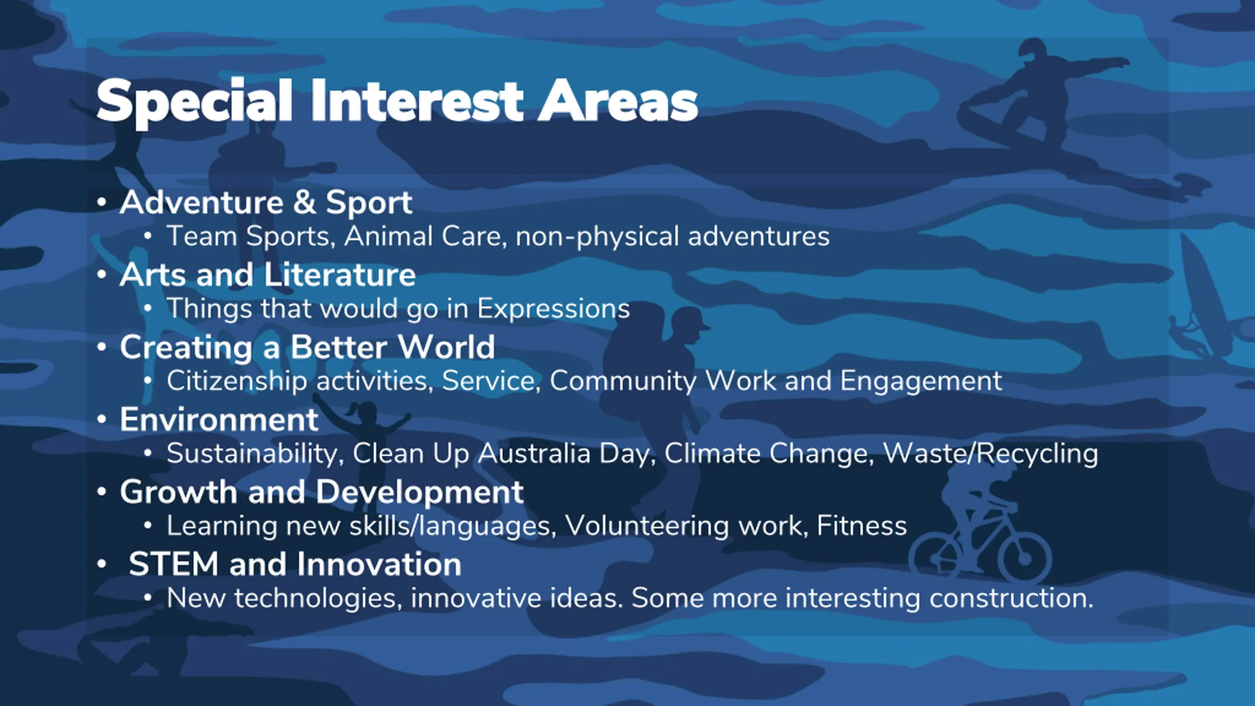 Special Interest Areas Special Interest Areas Adventure & Sport Team Sports, Animal Care, non-physical adventures Arts and Literature Things that would go in Expressions Creating a Better World Citizenship activities, Service, Community Work and Engagement Environment Sustainability, Clean Up Australia Day, Climate Change, Waste/Recycling Growth and Development Learning new skills/languages, Volunteering work, Fitness STEM and Innovation New technologies, innovative ideas. Some more interesting construction.