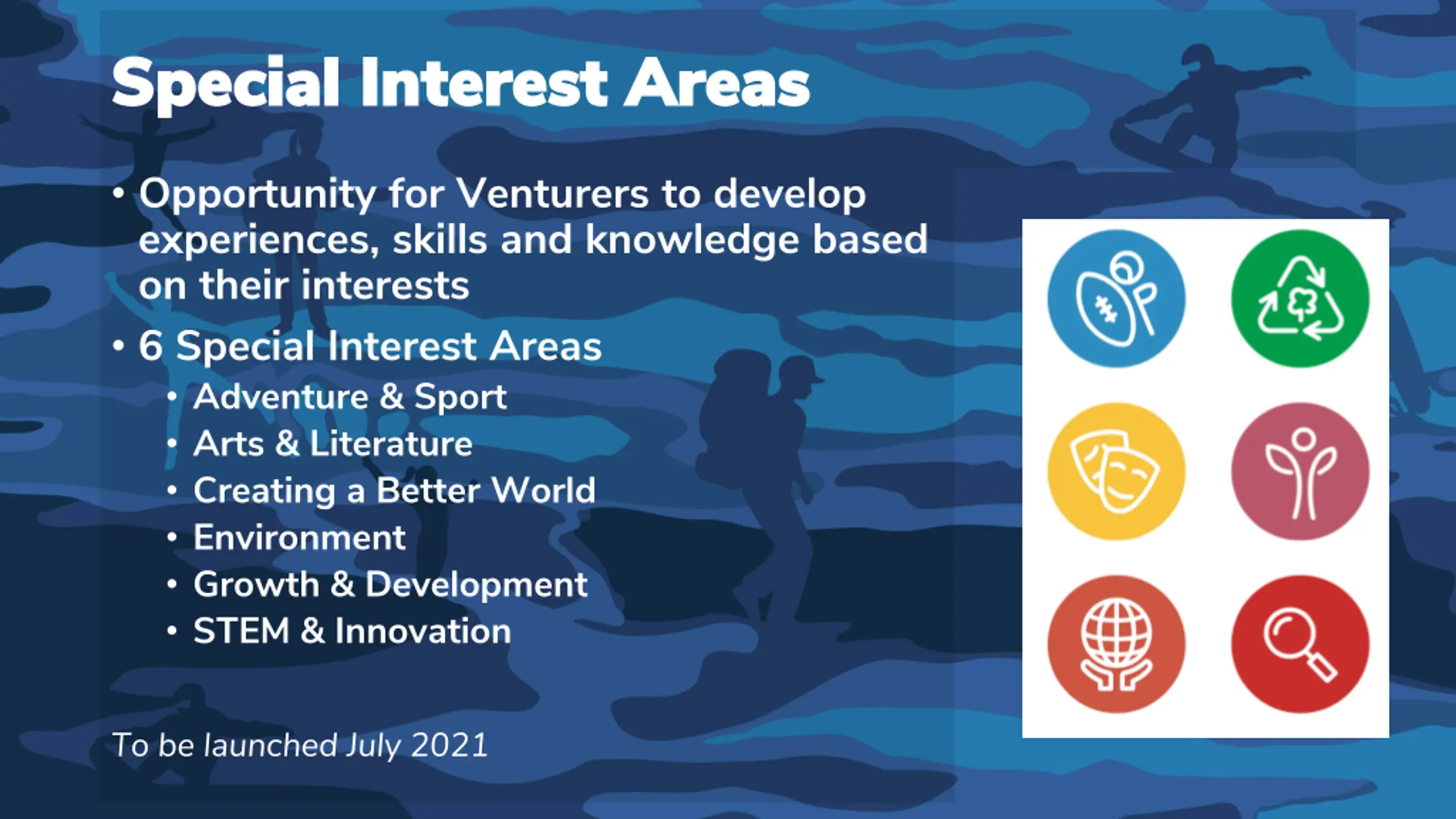 Special Interest Areas Special Interest Areas Opportunity for Venturers to develop experiences, skills and knowledge based on their interests 6 Special Interest Areas Adventure & Sport Arts & Literature Creating a Better World Environment Growth & Development STEM & Innovation To be launched July 2021