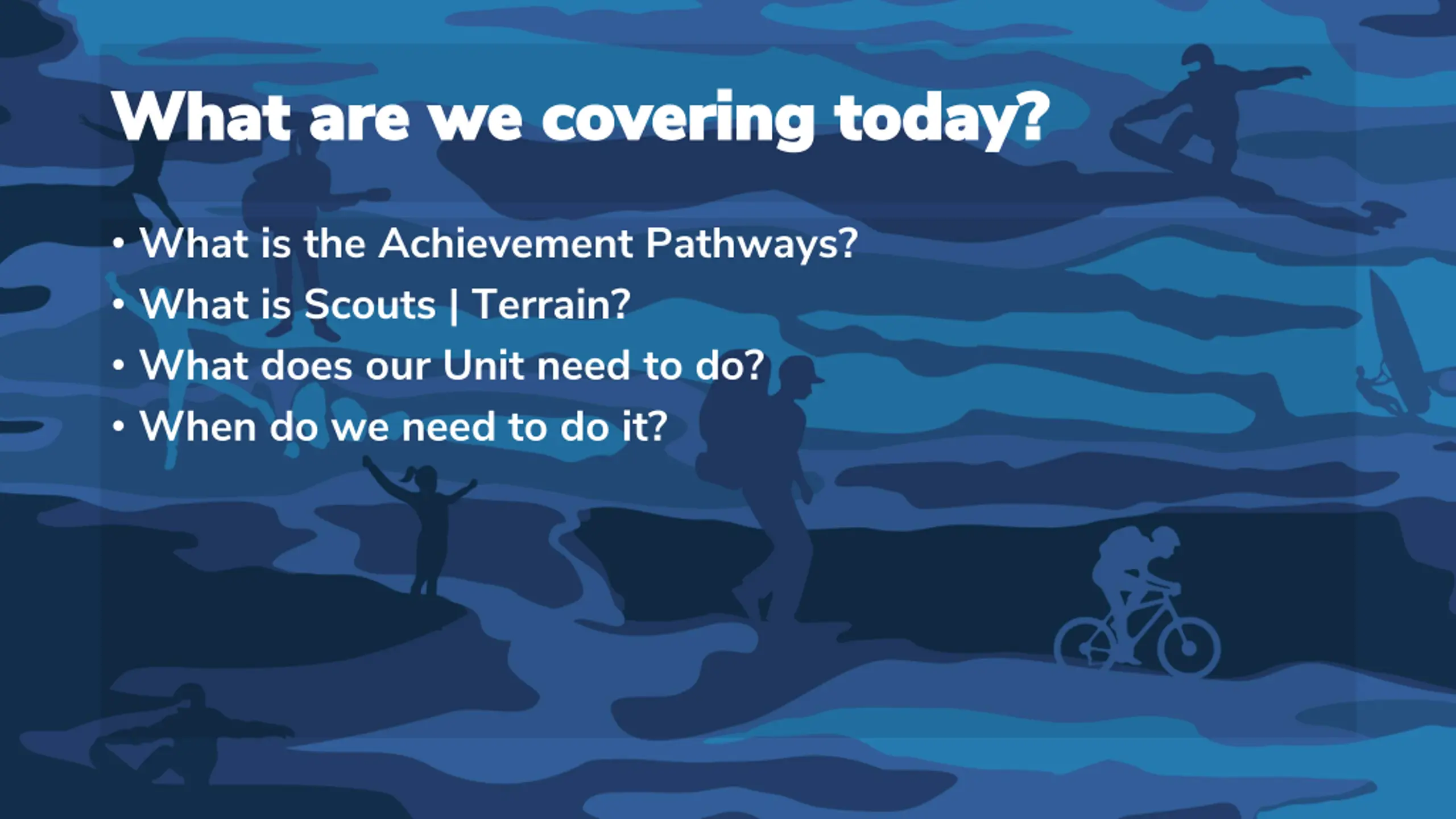 What are we covering today? What are we covering today? What is the Achievement Pathways? What is Scouts | Terrain? What does our Unit need to do? When do we need to do it?