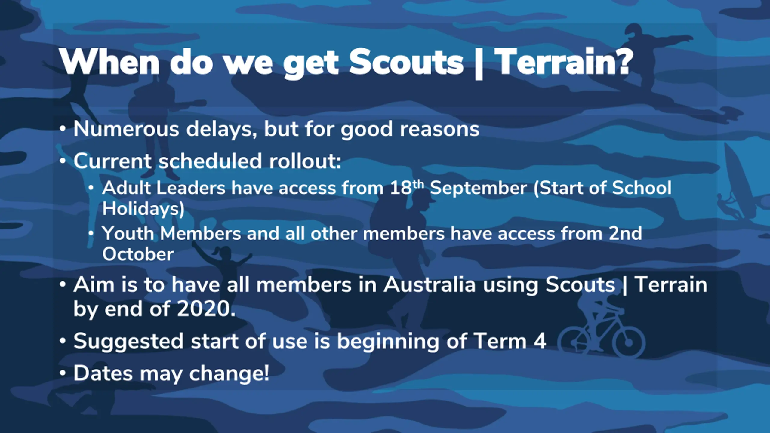 When do we get Scouts | Terrain? When do we get Scouts | Terrain? Numerous delays, but for good reasons Current scheduled rollout: Adult Leaders have access from 18th September (Start of School Holidays) Youth Members and all other members have access from 2nd October Aim is to have all members in Australia using Scouts | Terrain by end of 2020. Suggested start of use is beginning of Term 4 Dates may change!
