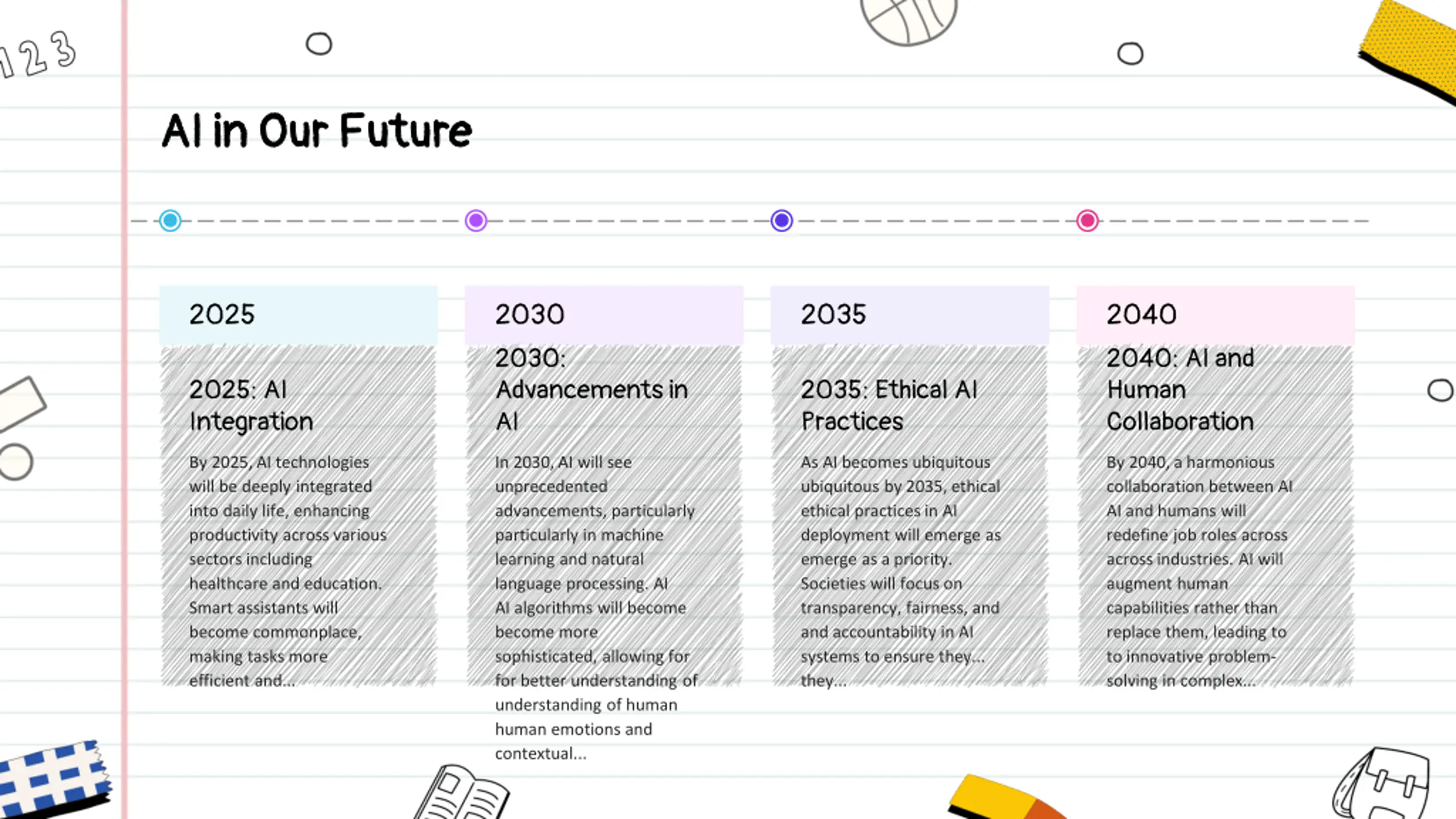 AI in Our Future AI in Our Future 2025 2030 2030: Advancements in AI 2035 2040 2040: AI and Human Collaboration 2025: AI Integration 2035: Ethical AI Practices By 2025, AI technologies will be deeply integrated into daily life, enhancing productivity across various sectors including healthcare and education. Smart assistants will become commonplace, making tasks more efficient and... In 2030, AI will see unprecedented advancements, particularly particularly in machine learning and natural language processing. AI AI algorithms will become become more sophisticated, allowing for for better understanding of understanding of human human emotions and contextual... As AI becomes ubiquitous ubiquitous by 2035, ethical ethical practices in AI deployment will emerge as emerge as a priority. Societies will focus on transparency, fairness, and and accountability in AI systems to ensure they... they... By 2040, a harmonious collaboration between AI AI and humans will redefine job roles across across industries. AI will augment human capabilities rather than replace them, leading to to innovative problem- solving in complex...