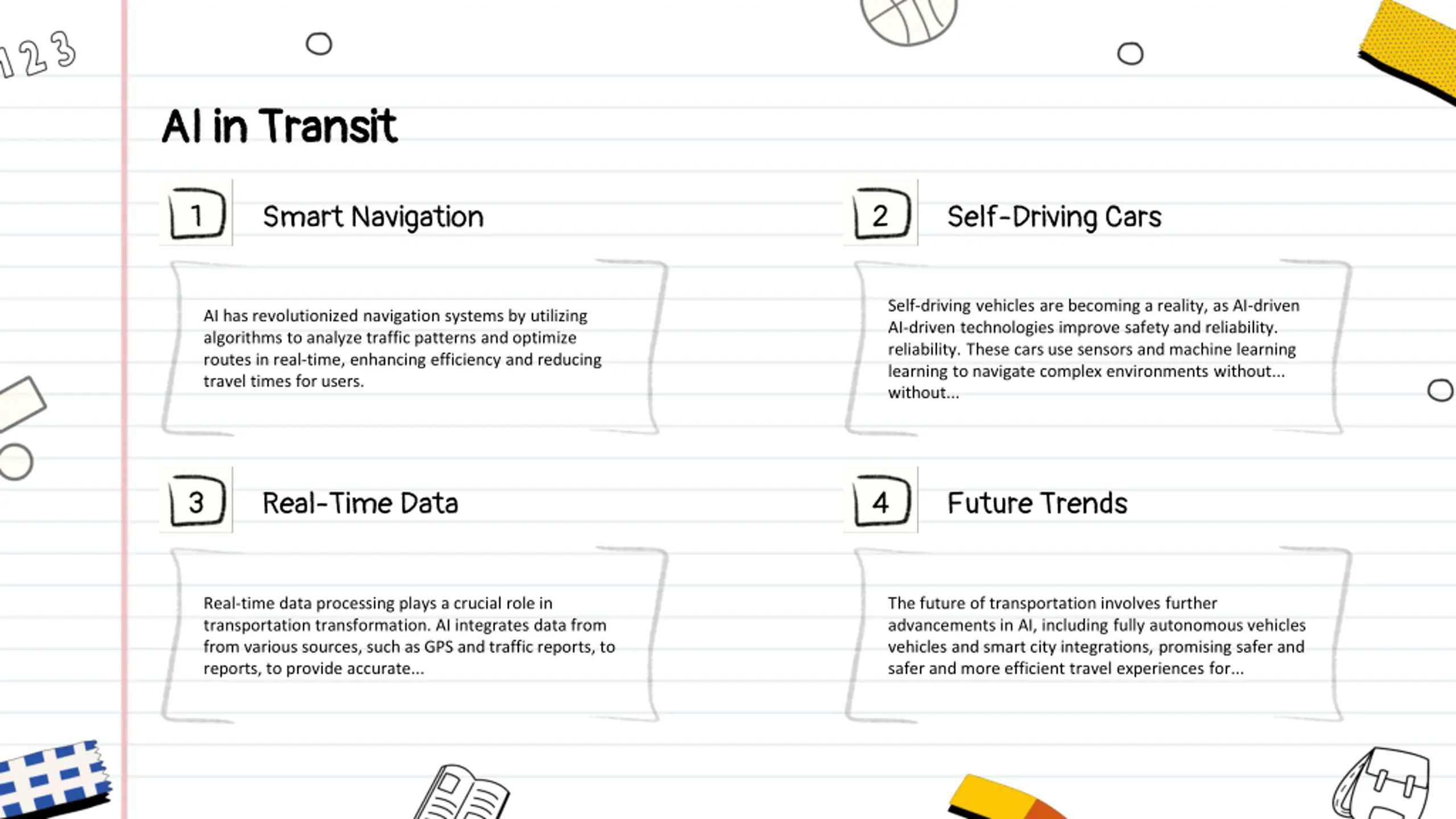 AI in Transit AI in Transit 1 2 Smart Navigation Self-Driving Cars Self-driving vehicles are becoming a reality, as AI AI- driven technologies improve safety and reliability. reliability. These cars use sensors and machine learning learning to navigate complex environments without... without... - driven AI has revolutionized navigation systems by utilizing algorithms to analyze traffic patterns and optimize routes in real-time, enhancing efficiency and reducing travel times for users. 3 4 Real-Time Data Future Trends Real-time data processing plays a crucial role in transportation transformation. AI integrates data from from various sources, such as GPS and traffic reports, to reports, to provide accurate... The future of transportation involves further advancements in AI, including fully autonomous vehicles vehicles and smart city integrations, promising safer and safer and more efficient travel experiences for...
