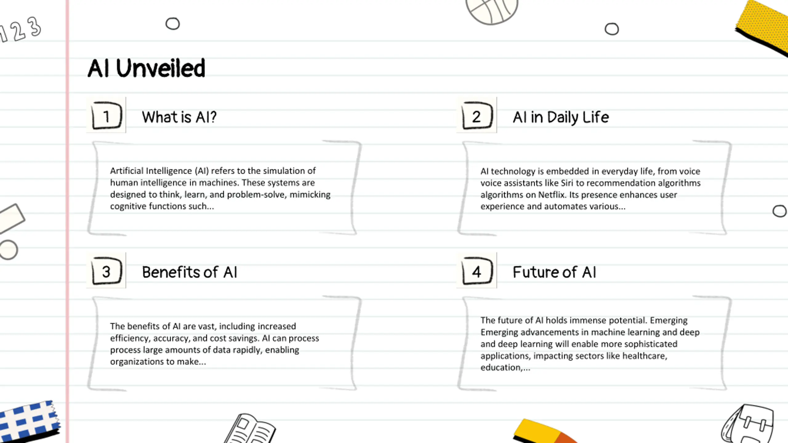 AI Unveiled AI Unveiled 1 2 What is AI? AI in Daily Life Artificial Intelligence (AI) refers to the simulation of human intelligence in machines. These systems are designed to think, learn, and problem-solve, mimicking cognitive functions such... AI technology is embedded in everyday life, from voice voice assistants like Siri to recommendation algorithms algorithms on Netflix. Its presence enhances user experience and automates various... 3 4 Benefits of AI Future of AI The future of AI holds immense potential. Emerging Emerging advancements in machine learning and deep and deep learning will enable more sophisticated applications, impacting sectors like healthcare, education,... The benefits of AI are vast, including increased efficiency, accuracy, and cost savings. AI can process process large amounts of data rapidly, enabling organizations to make...
