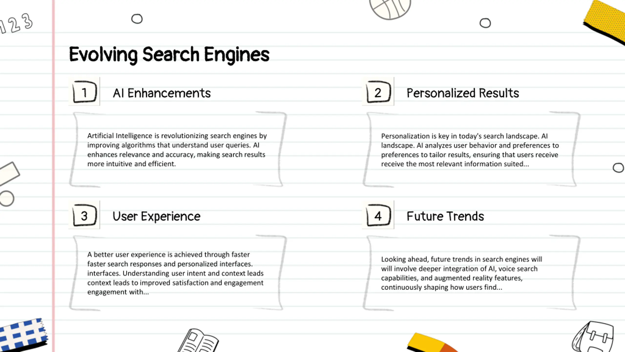 Evolving Search Engines Evolving Search Engines 1 2 AI Enhancements Personalized Results Artificial Intelligence is revolutionizing search engines by improving algorithms that understand user queries. AI enhances relevance and accuracy, making search results more intuitive and efficient. Personalization is key in today's search landscape. AI landscape. AI analyzes user behavior and preferences to preferences to tailor results, ensuring that users receive receive the most relevant information suited... 3 4 User Experience Future Trends A better user experience is achieved through faster faster search responses and personalized interfaces. interfaces. Understanding user intent and context leads context leads to improved satisfaction and engagement engagement with... Looking ahead, future trends in search engines will will involve deeper integration of AI, voice search capabilities, and augmented reality features, continuously shaping how users find...