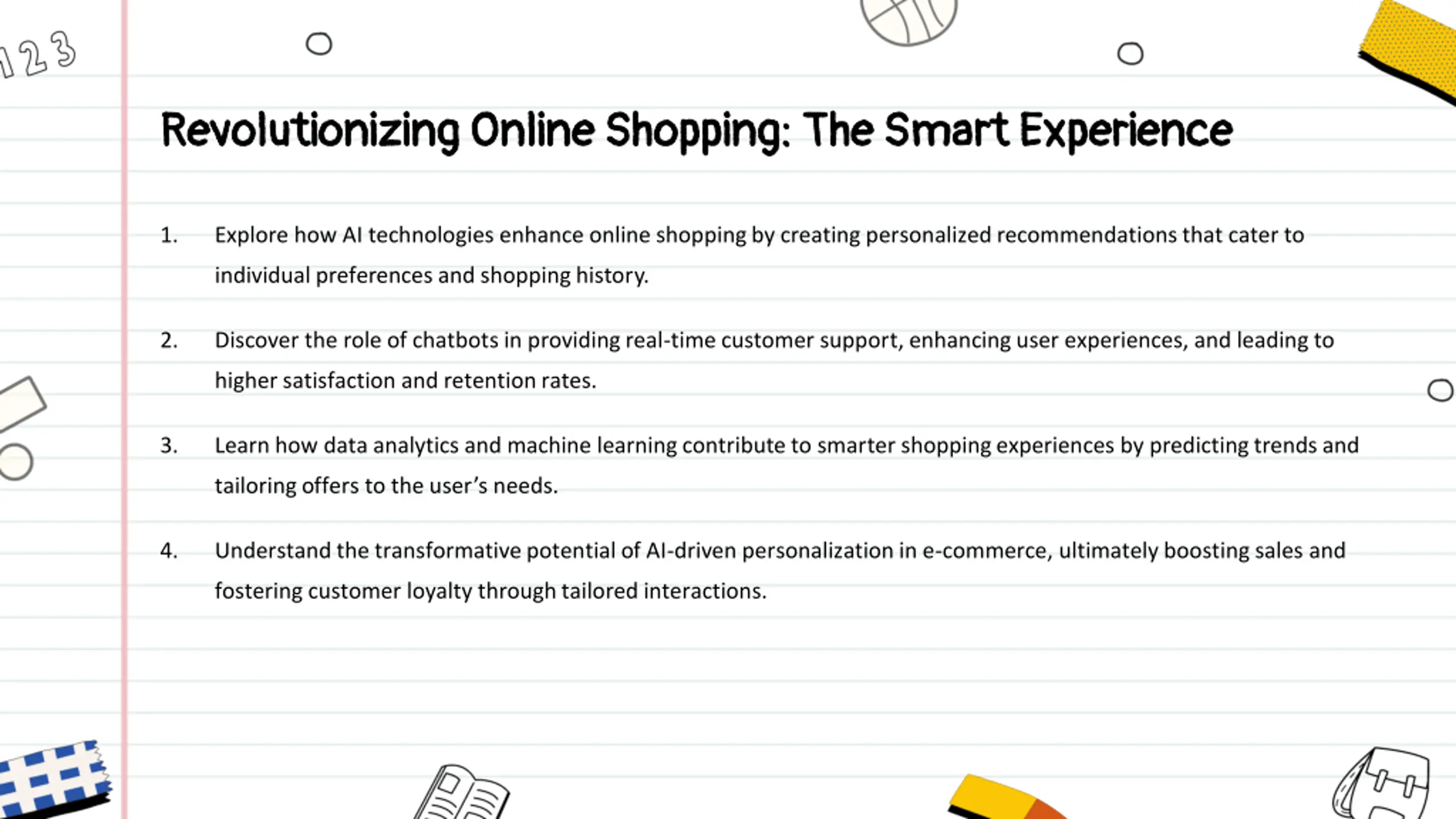 Revolutionizing Online Shopping: The Smart Experience Revolutionizing Online Shopping: The Smart Experience 1. Explore how AI technologies enhance online shopping by creating personalized recommendations that cater to individual preferences and shopping history. 2. Discover the role of chatbots in providing real-time customer support, enhancing user experiences, and leading to higher satisfaction and retention rates. 3. Learn how data analytics and machine learning contribute to smarter shopping experiences by predicting trends and tailoring offers to the user s needs. 4. Understand the transformative potential of AI-driven personalization in e-commerce, ultimately boosting sales and fostering customer loyalty through tailored interactions.