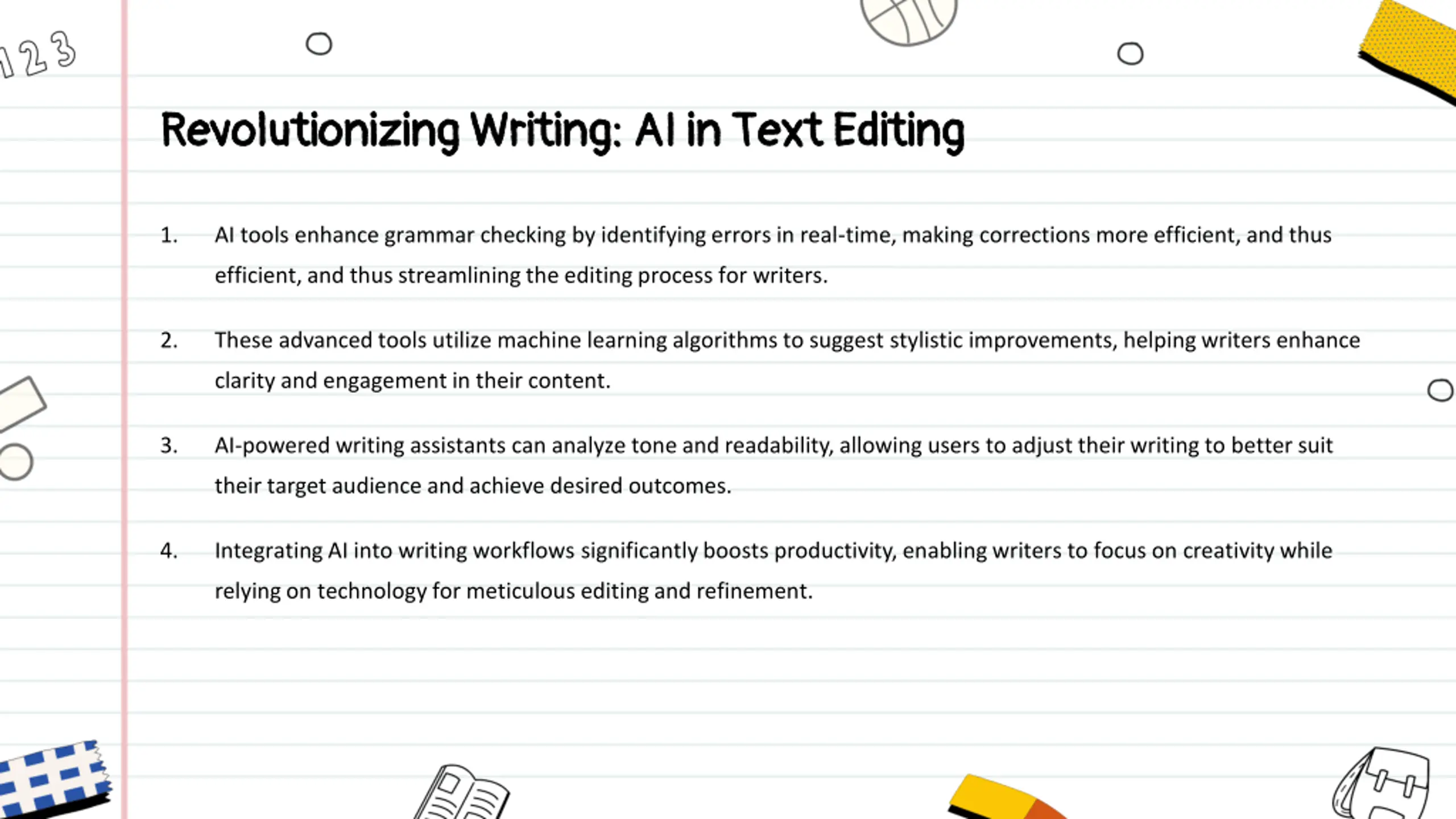 Revolutionizing Writing: AI in Text Editing Revolutionizing Writing: AI in Text Editing 1. AI tools enhance grammar checking by identifying errors in real-time, making corrections more efficient, and thus efficient, and thus streamlining the editing process for writers. 2. These advanced tools utilize machine learning algorithms to suggest stylistic improvements, helping writers enhance clarity and engagement in their content. 3. AI-powered writing assistants can analyze tone and readability, allowing users to adjust their writing to better suit their target audience and achieve desired outcomes. 4. Integrating AI into writing workflows significantly boosts productivity, enabling writers to focus on creativity while relying on technology for meticulous editing and refinement.