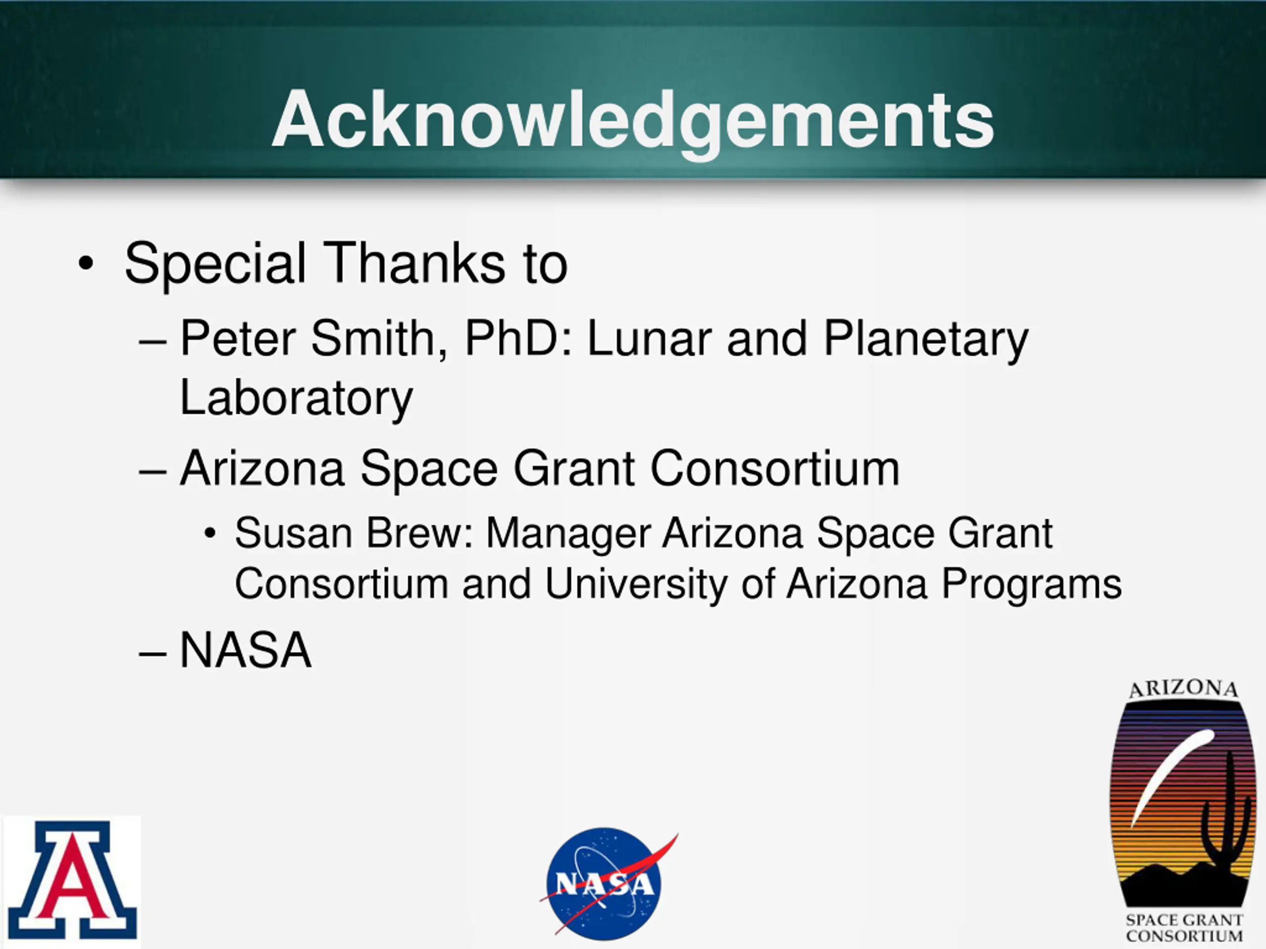 Acknowledgements Special Thanks to Peter Smith, PhD: Lunar and Planetary Laboratory Arizona Space Grant Consortium Susan Brew: Manager Arizona Space Grant Consortium and University of Arizona Programs NASA