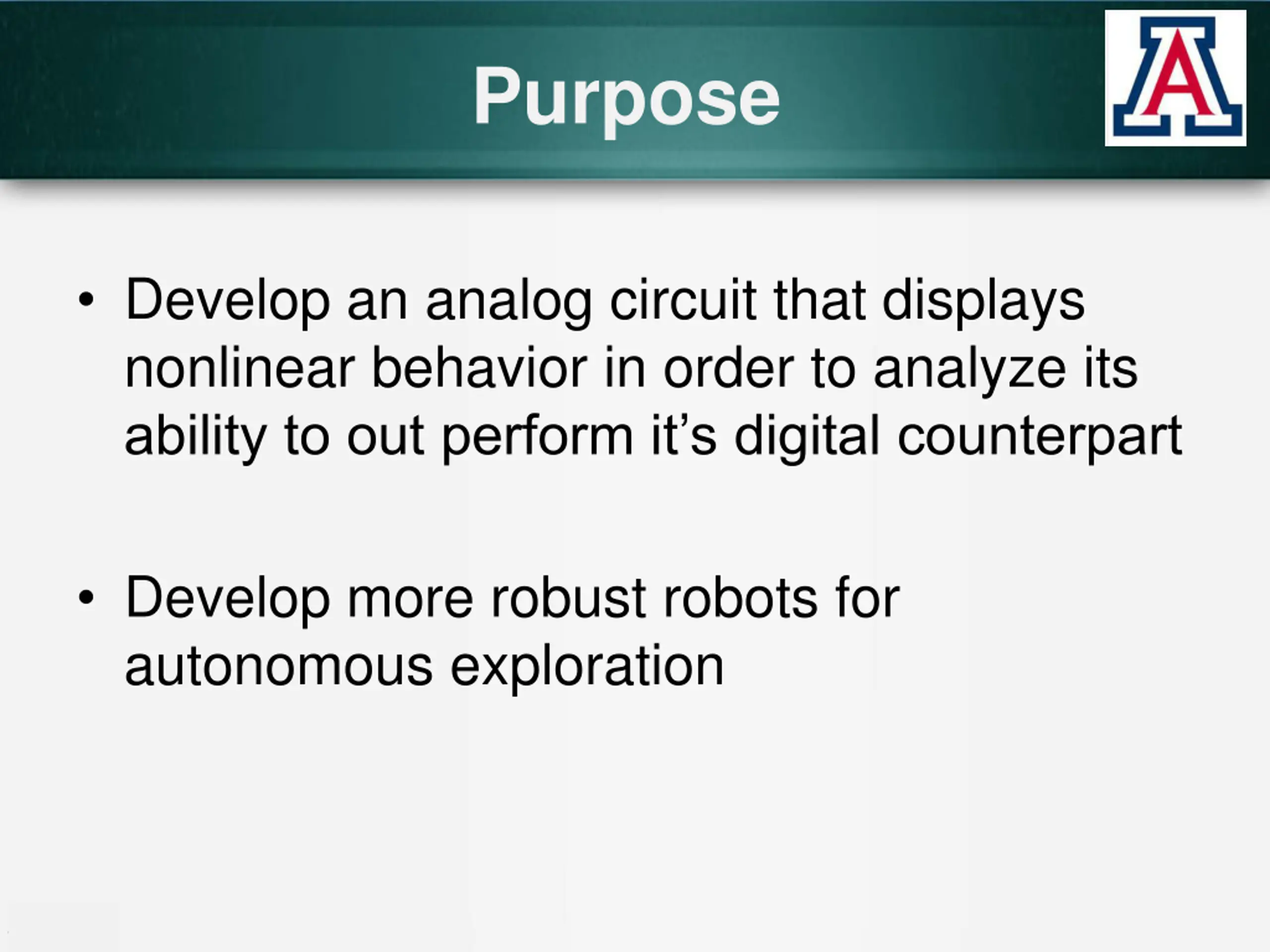 Purpose Develop an analog circuit that displays nonlinear behavior in order to analyze its ability to out perform it s digital counterpart Develop more robust robots for autonomous exploration