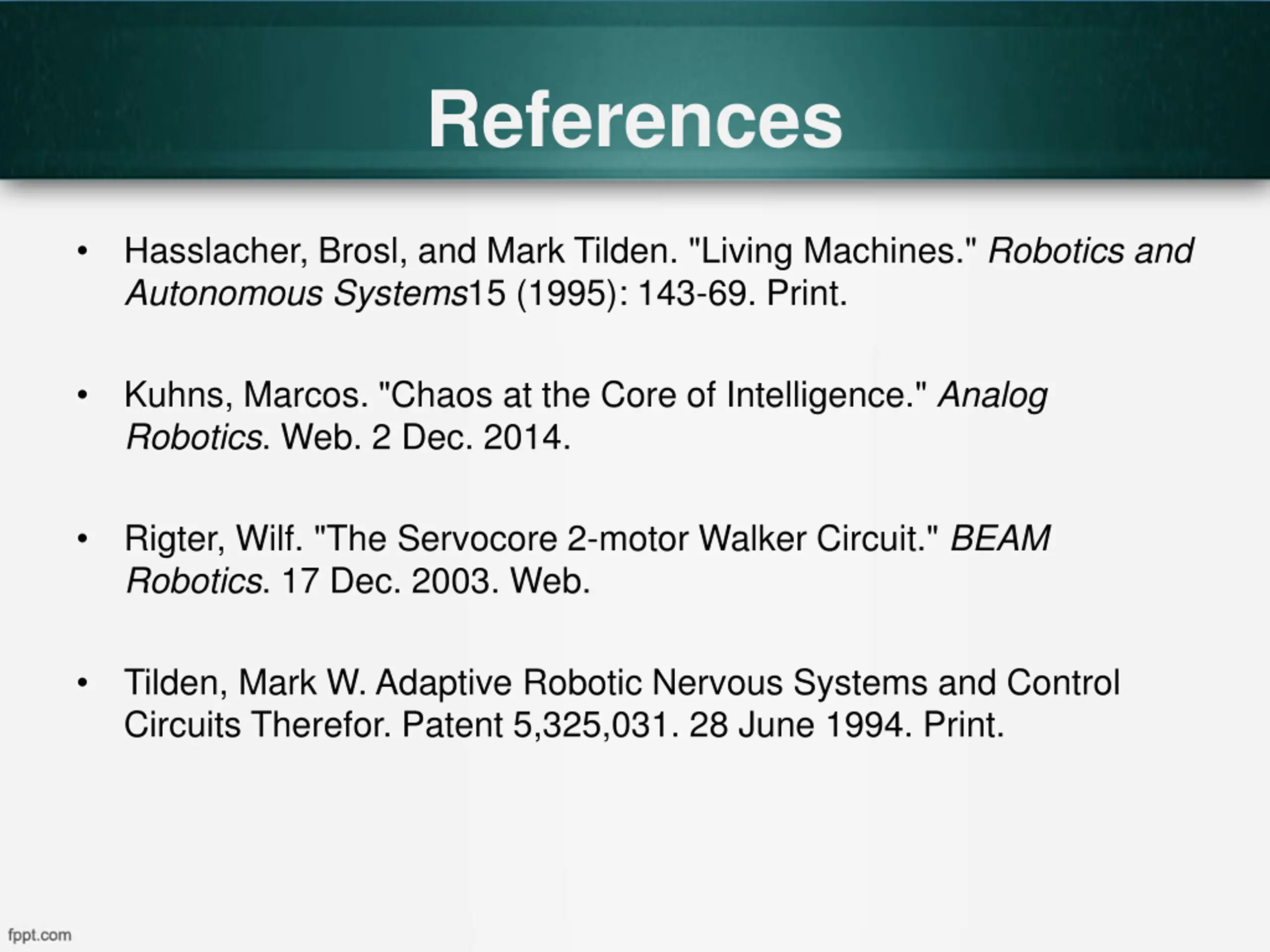 References Hasslacher, Brosl, and Mark Tilden. "Living Machines." Robotics and Autonomous Systems15 (1995): 143-69. Print. Kuhns, Marcos. "Chaos at the Core of Intelligence." Analog Robotics. Web. 2 Dec. 2014. Rigter, Wilf. "The Servocore 2-motor Walker Circuit." BEAM Robotics. 17 Dec. 2003. Web. Tilden, Mark W. Adaptive Robotic Nervous Systems and Control Circuits Therefor. Patent 5,325,031. 28 June 1994. Print.