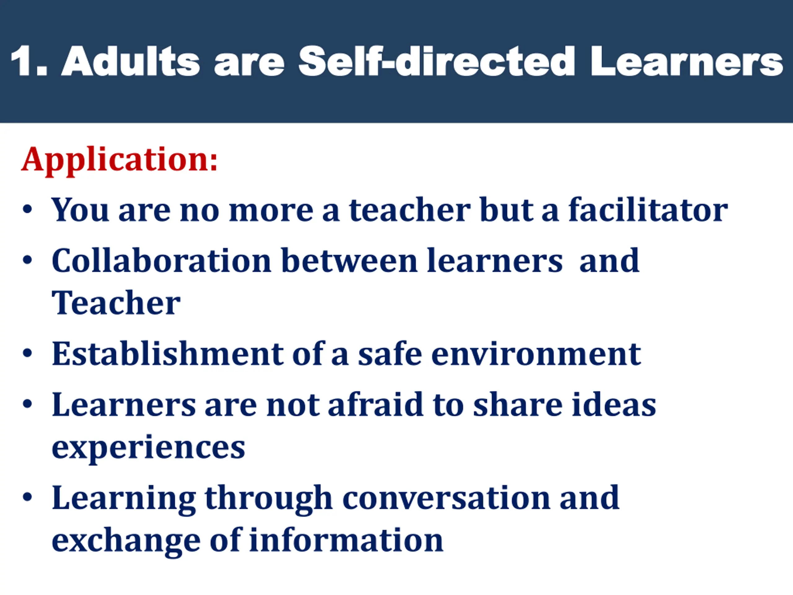 1. Adults 1. Adults are are Self Self- -directed Learners directed Learners Application: You are no more a teacher but a facilitator Collaboration between learners and Teacher Establishment of a safe environment Learners are not afraid to share ideas experiences Learning through conversation and exchange of information