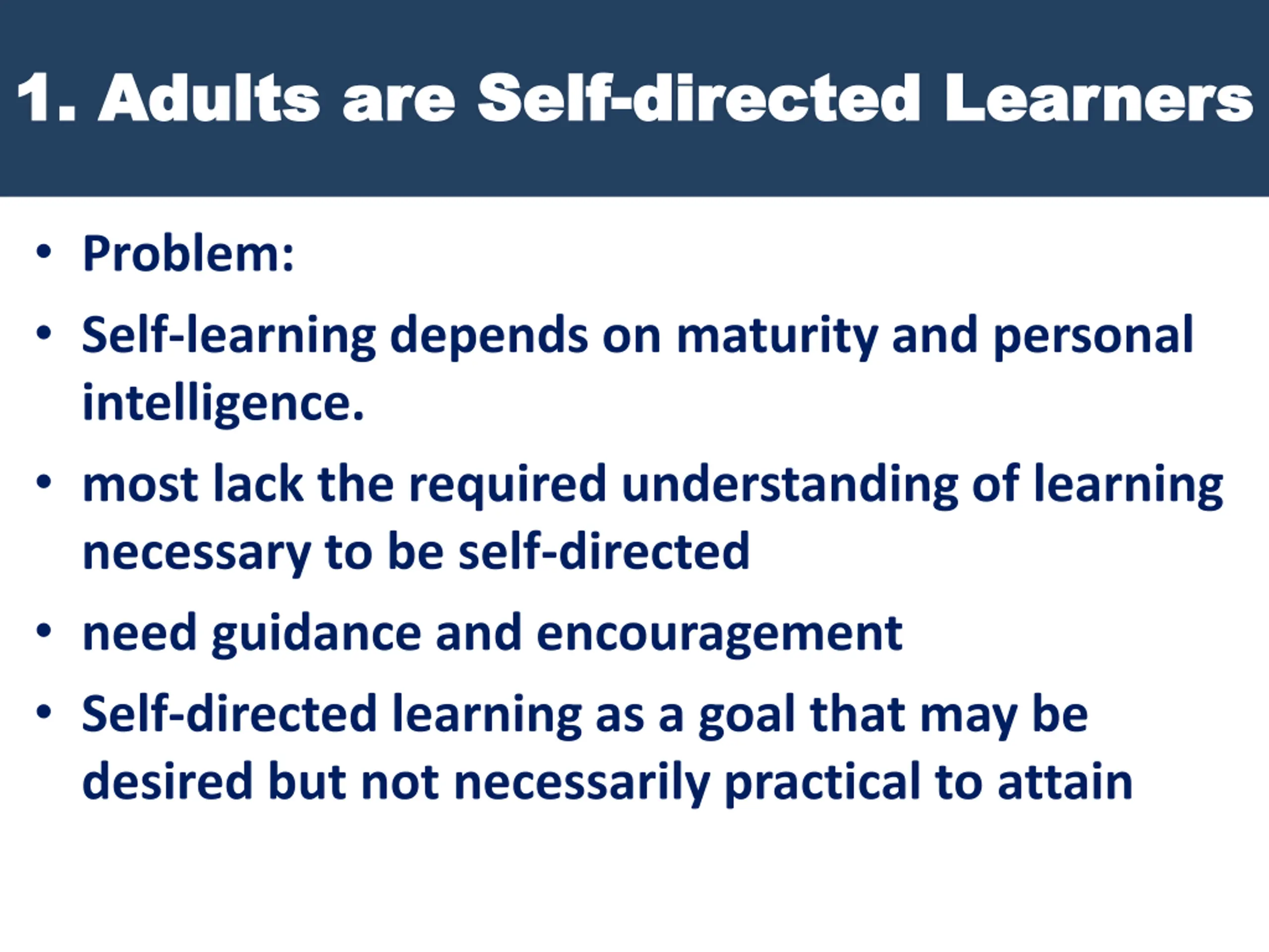 1. Adults 1. Adults are are Self Self- -directed Learners directed Learners Problem: Self-learning depends on maturity and personal intelligence. most lack the required understanding of learning necessary to be self-directed need guidance and encouragement Self-directed learning as a goal that may be desired but not necessarily practical to attain