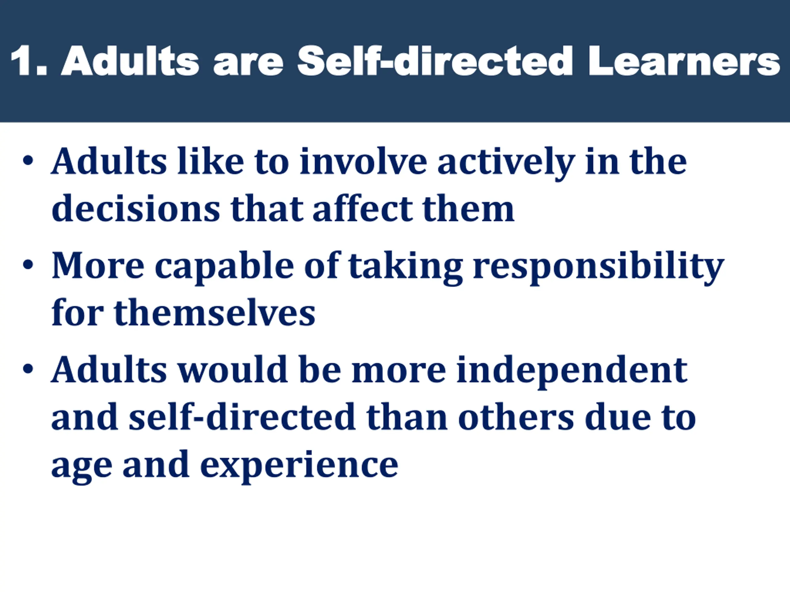1. Adults 1. Adults are are Self Self- -directed Learners directed Learners Adults like to involve actively in the decisions that affect them More capable of taking responsibility for themselves Adults would be more independent and self-directed than others due to age and experience