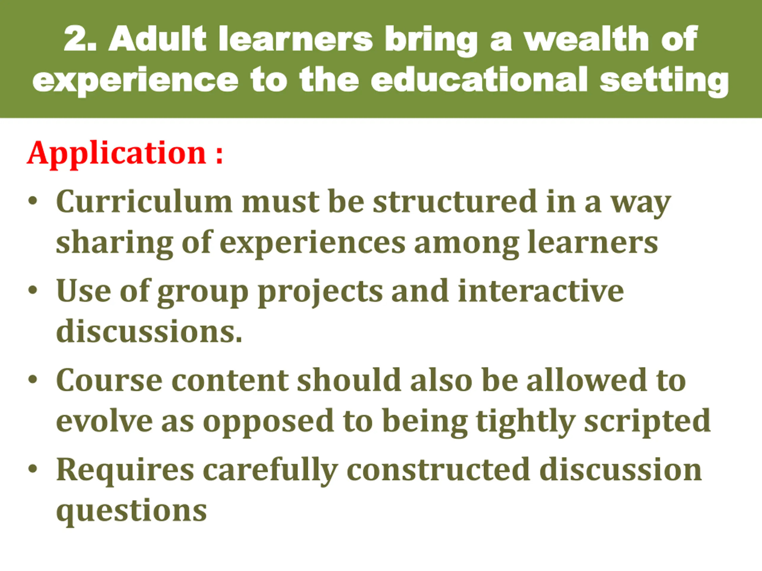 2. Adult 2. Adult learners bring a wealth of learners bring a wealth of experience to the educational experience to the educational setting setting Application : Curriculum must be structured in a way sharing of experiences among learners Use of group projects and interactive discussions. Course content should also be allowed to evolve as opposed to being tightly scripted Requires carefully constructed discussion questions