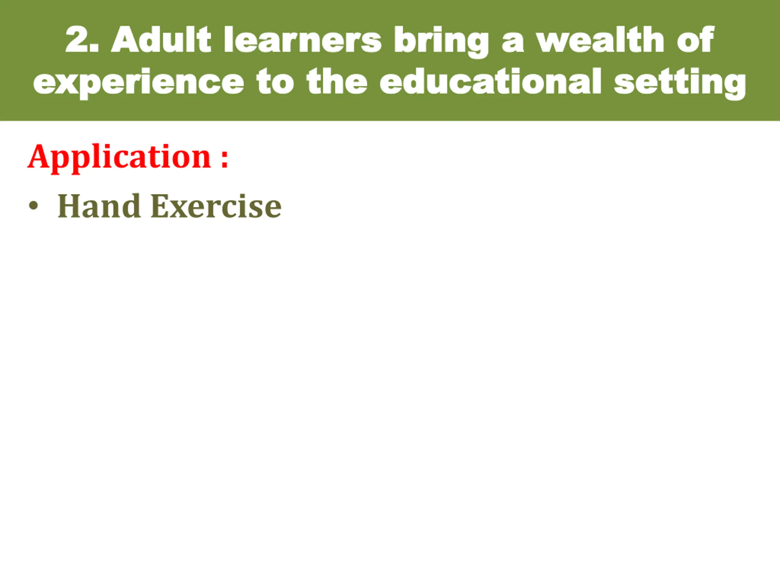 2. Adult 2. Adult learners bring a wealth of learners bring a wealth of experience to the educational experience to the educational setting setting Application : Hand Exercise