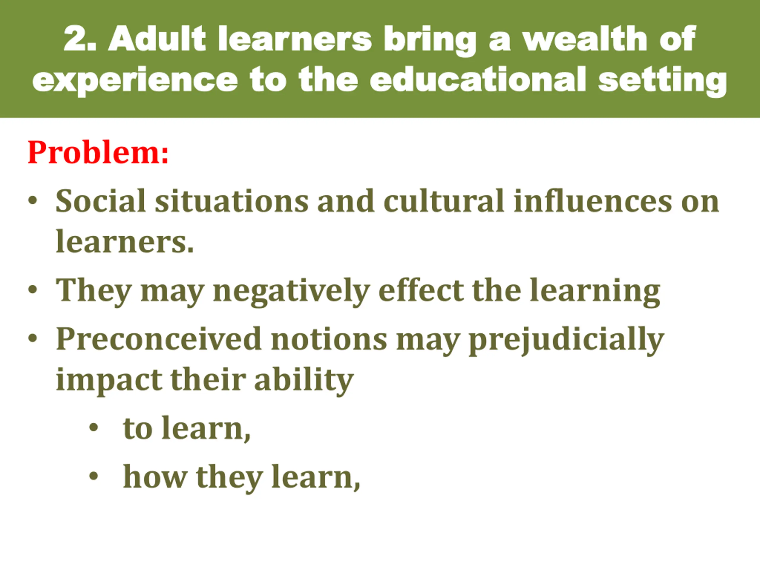 2. Adult 2. Adult learners bring a wealth of learners bring a wealth of experience to the educational experience to the educational setting setting Problem: Social situations and cultural influences on learners. They may negatively effect the learning Preconceived notions may prejudicially impact their ability to learn, how they learn,