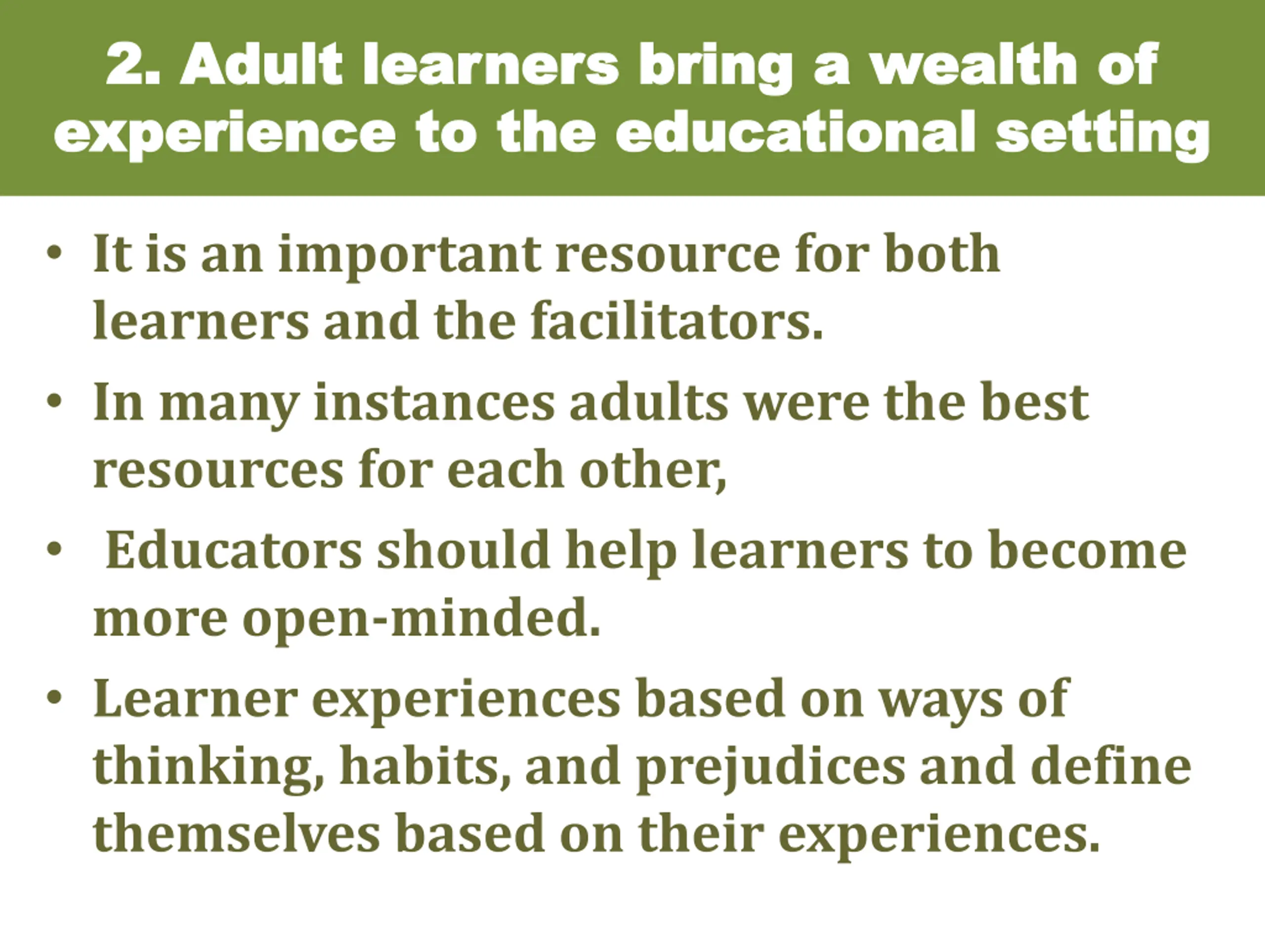 2. Adult 2. Adult learners bring a wealth of learners bring a wealth of experience to the educational experience to the educational setting setting It is an important resource for both learners and the facilitators. In many instances adults were the best resources for each other, Educators should help learners to become more open-minded. Learner experiences based on ways of thinking, habits, and prejudices and define themselves based on their experiences.
