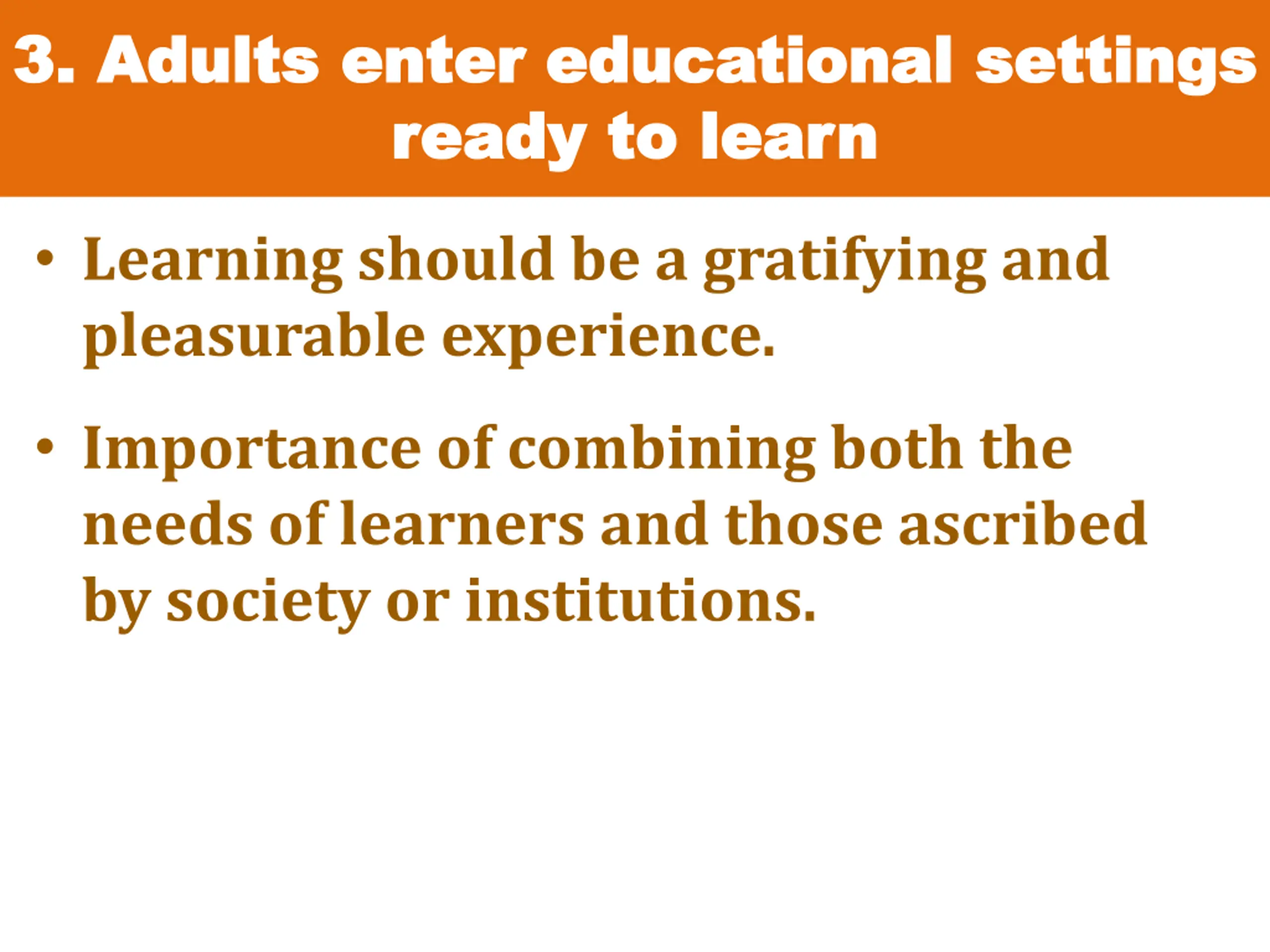 3. Adults 3. Adults enter educational settings enter educational settings ready to ready to learn learn Learning should be a gratifying and pleasurable experience. Importance of combining both the needs of learners and those ascribed by society or institutions.