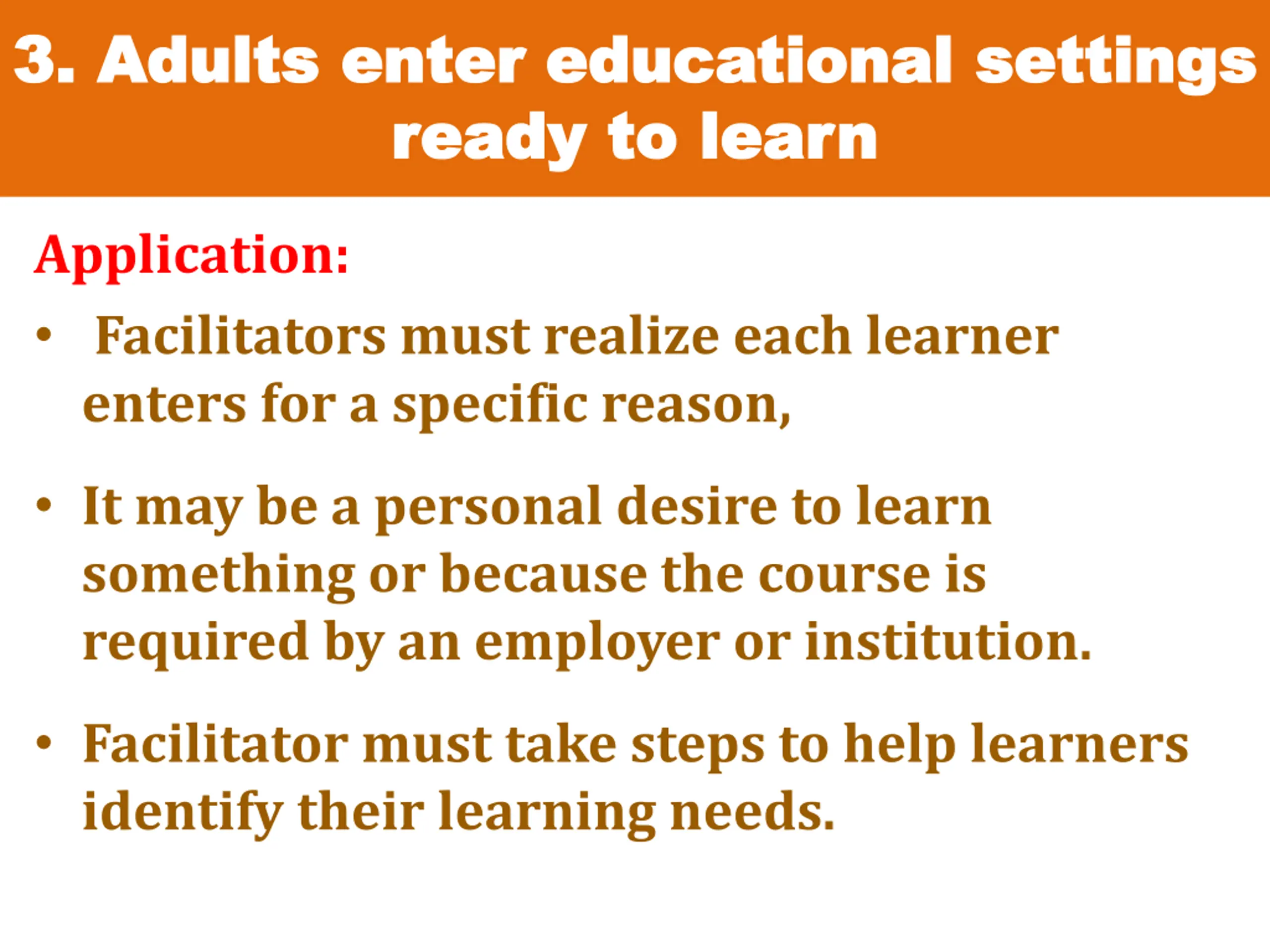 3. Adults 3. Adults enter educational settings enter educational settings ready to ready to learn learn Application: Facilitators must realize each learner enters for a specific reason, It may be a personal desire to learn something or because the course is required by an employer or institution. Facilitator must take steps to help learners identify their learning needs.