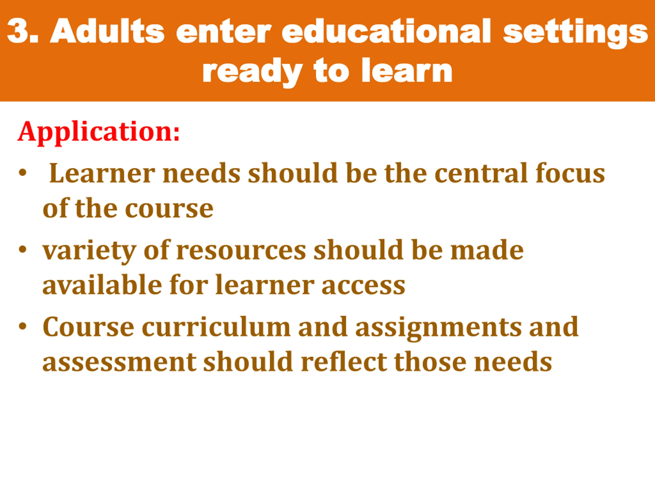 3. Adults 3. Adults enter educational settings enter educational settings ready to ready to learn learn Application: Learner needs should be the central focus of the course variety of resources should be made available for learner access Course curriculum and assignments and assessment should reflect those needs