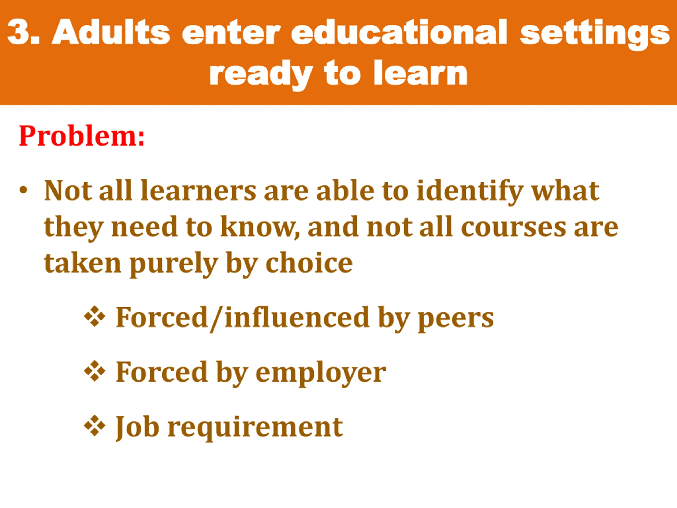 3. Adults 3. Adults enter educational settings enter educational settings ready to ready to learn learn Problem: Not all learners are able to identify what they need to know, and not all courses are taken purely by choice Forced/influenced by peers Forced by employer Job requirement