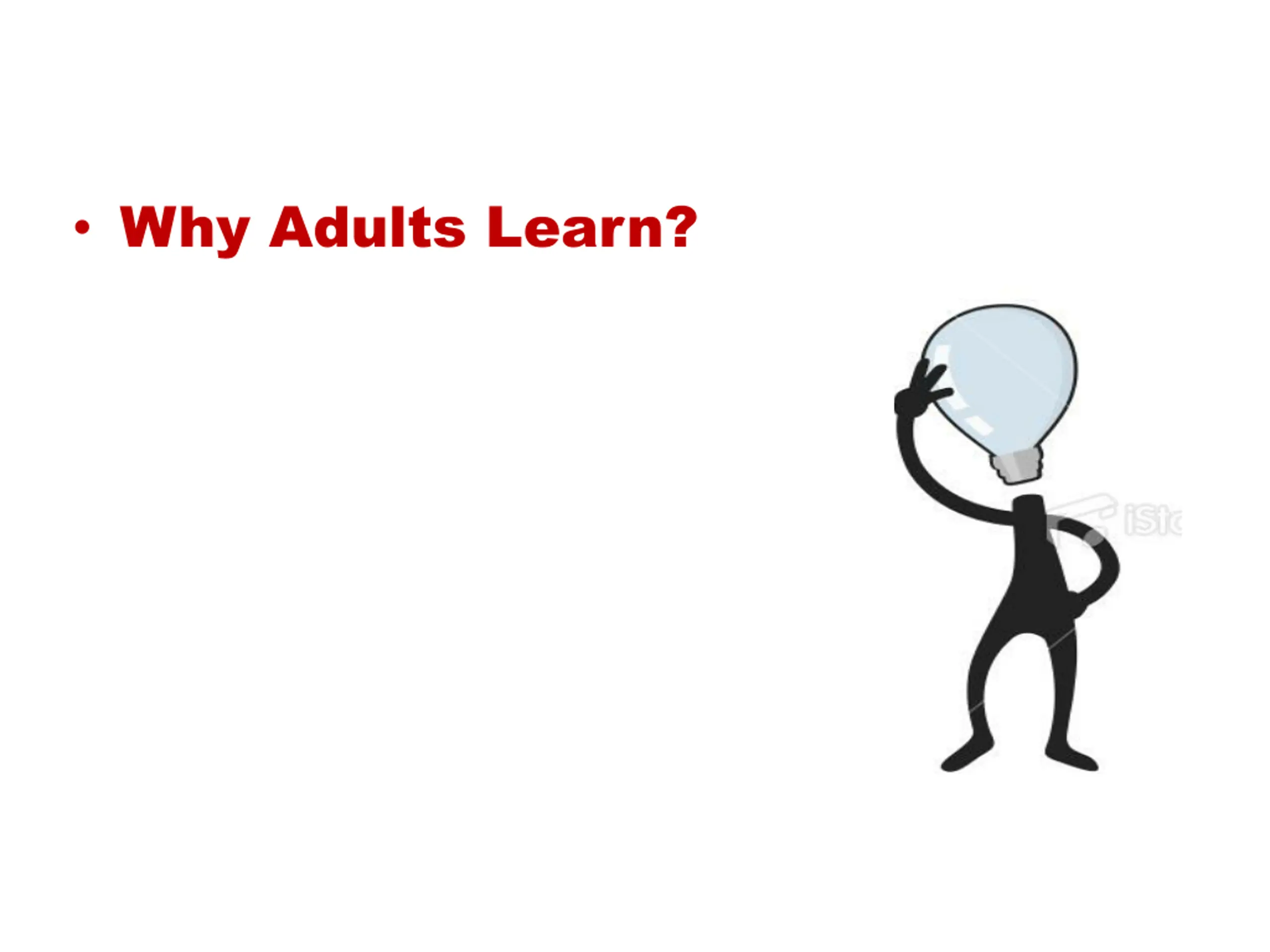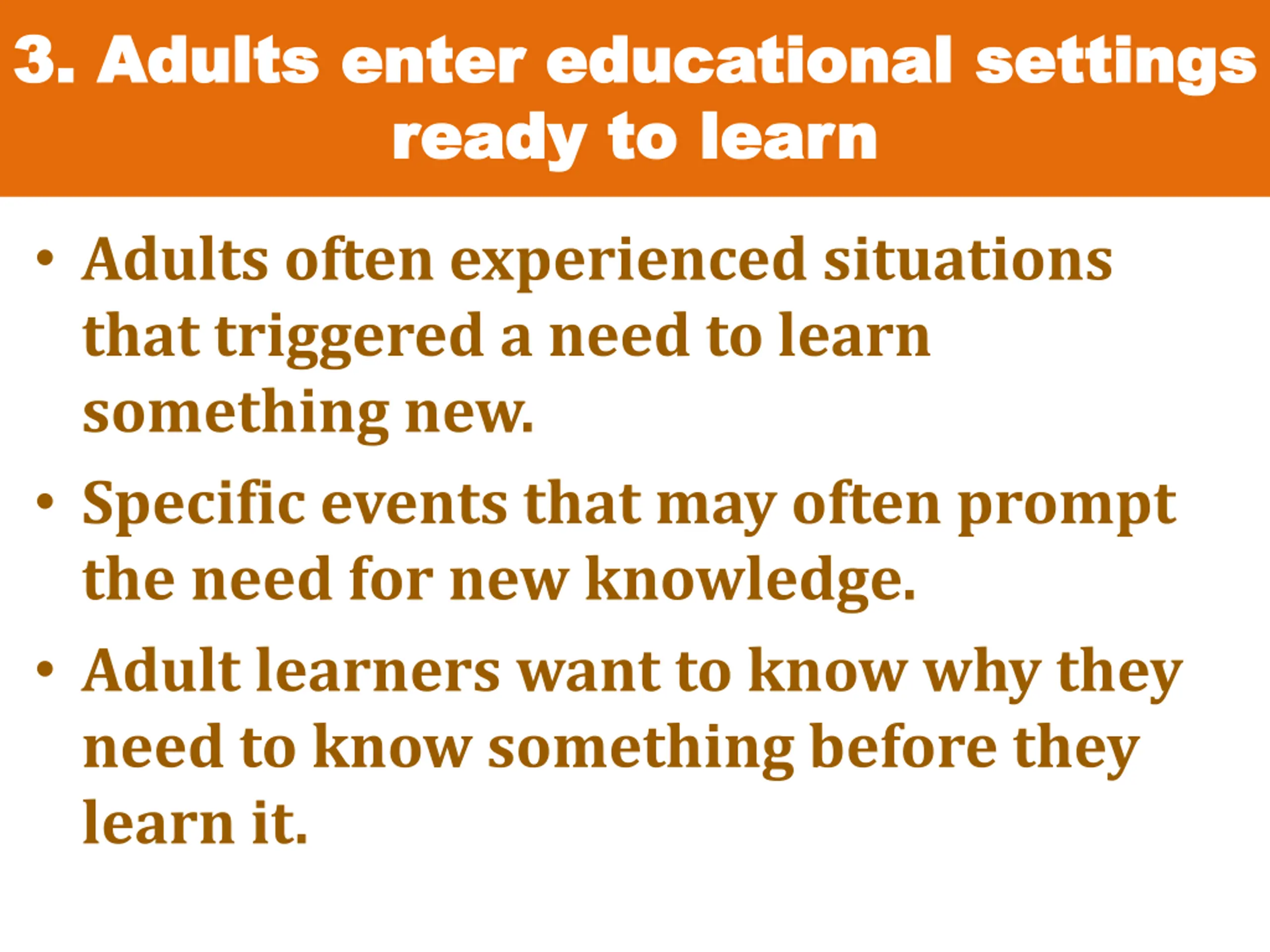 3. Adults 3. Adults enter educational settings enter educational settings ready to ready to learn learn Adults often experienced situations that triggered a need to learn something new. Specific events that may often prompt the need for new knowledge. Adult learners want to know why they need to know something before they learn it.