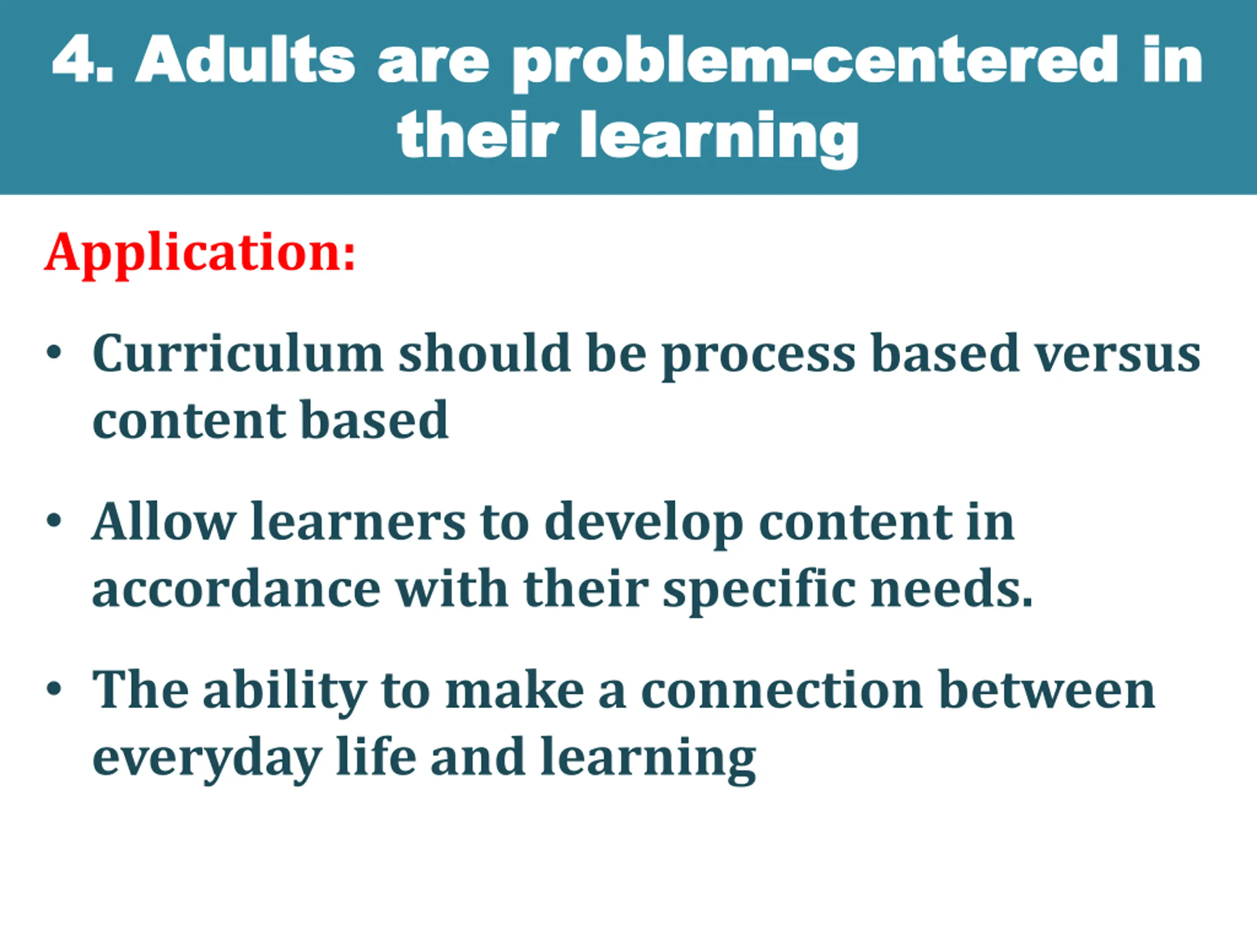 4. Adults 4. Adults are problem are problem- -centered in their their learning learning centered in Application: Curriculum should be process based versus content based Allow learners to develop content in accordance with their specific needs. The ability to make a connection between everyday life and learning